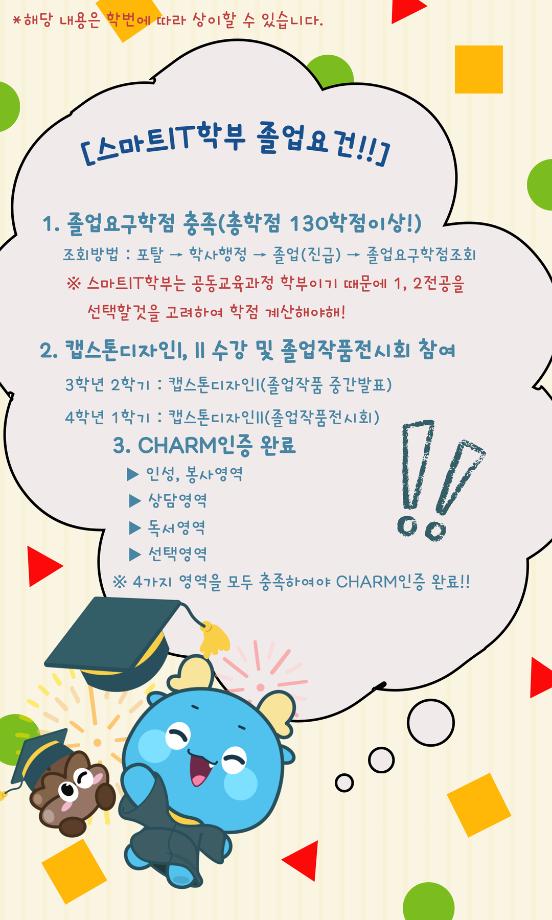 본문 시작 홈으로 SMIT 소식 SMIT 소개 SMIT 교육 SMIT 취업 SMIT 소식 SMIT 입학 홈페이지가이드 갤러리 공지사항 갤러리 경진대회 동아리 갤러리 페이스북 트위터 프린트 스마트IT알림_4월 : 스마트IT학부 졸업요건 스마트IT학부 56 2026-04-14 스마트IT알림_4월 : 스마트IT학부 졸업요건 목록 이전세명대알림_4월(2) : 세명대학교 벚꽃 담당부서 : 스마트IT학부 담당자 : - 연락처 : 043-649-1275 최종수정일 : 2024-10-26 만족도조사 만족도 조사 이 페이지에서 제공하는 정보에 대하여 만족하시나요? 매우만족 만족 보통 불만족 매우불만족