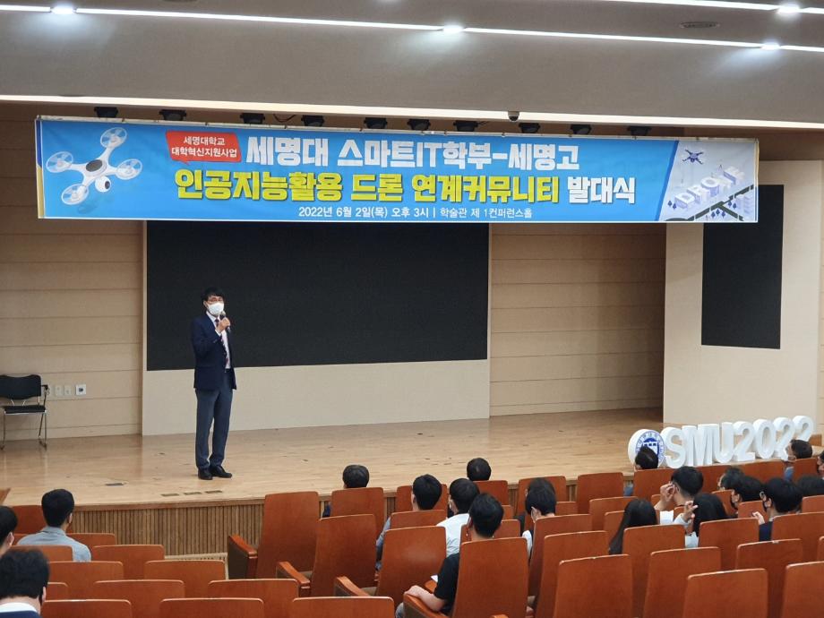 스마트IT학부는 6월 2일(목) 오후 3시부터 학술관 제1컨퍼런스홀에서 2022년도 대학혁신지원사업의 일환으로 관내 세명고등학교와 연계하여, [인공지능을 활용한 드론 분야]에서 커뮤니티 활동을 시작하는 발대식을 진행하였다.