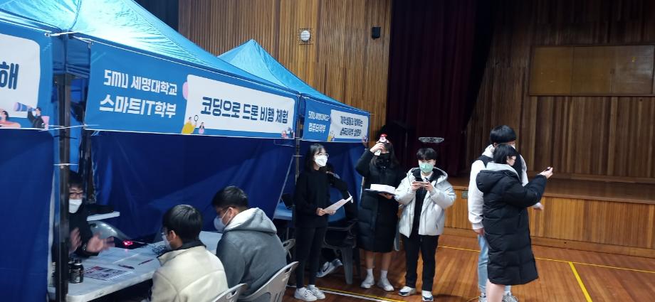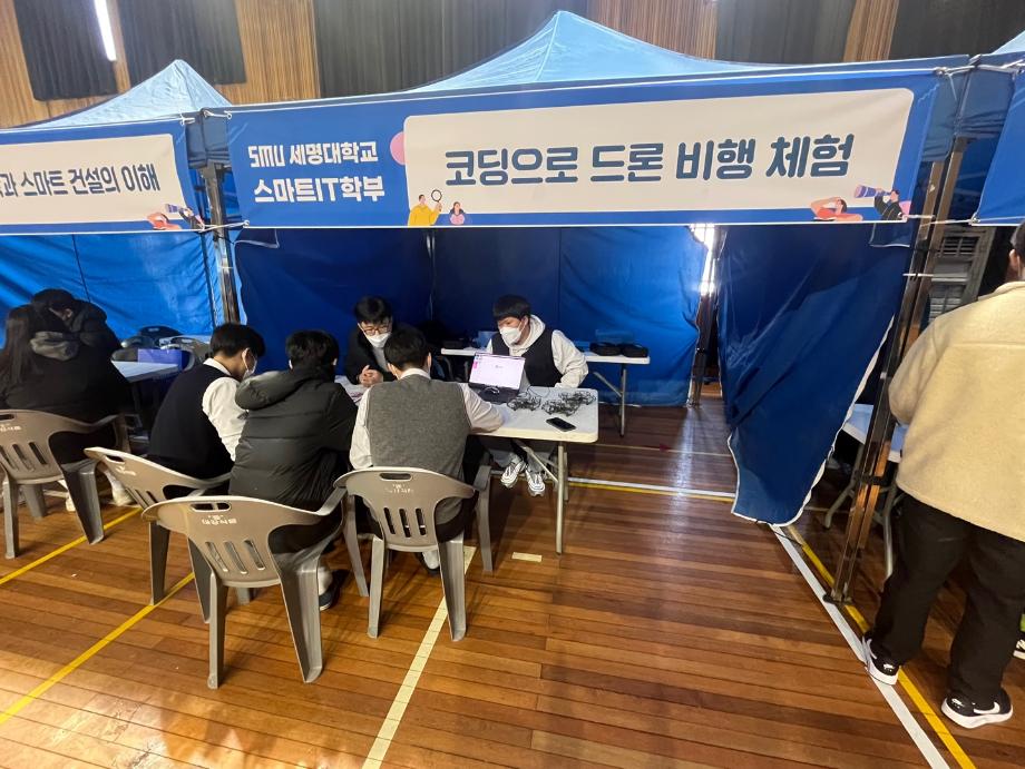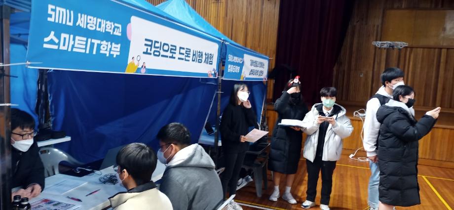 본문 시작 홈으로 SMIT 소식 SMIT 소개 SMIT 교육 SMIT 취업 SMIT 소식 SMIT 입학 홈페이지가이드 갤러리 공지사항 갤러리 경진대회 동아리 갤러리 페이스북 트위터 프린트 스마트IT학부 단양고 중등교육 연계프로그램 시행 스마트IT학부 5074 2022-12-22 스마트IT학부는 2022.12.22(목)에 단양고등학교 전공체험에 참가하였다. 한상익 교수님 주관으로 진행 되었으며, 스마트IT학부 재학생들이 보조 학생으로 참가하였다. 전공체험은 '코딩으로 드론 비행 체험'이라는 주제로 진행되었다. 단양고등학교 학생들에게 드론 조종법을 교육하고, 드론 비행 체험을 진행하게 하였다. 또한 스마트IT학부의 드론,자율주행차와 인공지능응용 전공에 대하여 소개하였다. 목록 이전스마트IT학부 2022학년도 2학기 전공학습동아리 수료 다음 스마트IT학부 정보처리기사 자격증 특강 시행 담당부서 : 스마트IT학부 담당자 : - 연락처 : 043-649-1275 최종수정일 : 2024-10-26 만족도조사 만족도 조사 이 페이지에서 제공하는 정보에 대하여 만족하시나요? 매우만족 만족 보통 불만족 매우불만족