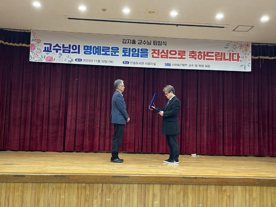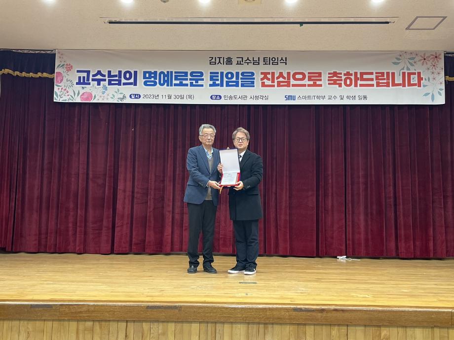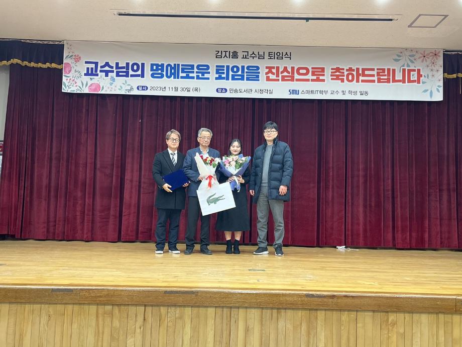 본문 시작 홈으로 SMIT 소식 SMIT 소개 SMIT 교육 SMIT 취업 SMIT 소식 SMIT 입학 홈페이지가이드 갤러리 공지사항 갤러리 경진대회 동아리 갤러리 페이스북 트위터 프린트 김지홍 교수님 퇴임식 진행 스마트IT학부 4053 2023-12-04 2023.11.30(목)에 스마트IT학부 김지홍 교수님의 명예로운 퇴임식이 시행 되었다. 본 행사는 <캡스톤 디자인 중간 발표회> 행사가 끝난 후 진행 되었다. 학생들의 영상편지와 재직 기념패 증정 및 꽃다발 증정으로 이루어졌다. 김지홍 교수님의 퇴임사와 권혁민 교수님의 축하 인사말이 있었다. 스마트IT학부 재학생들과 교수님들은 진심으로 김지홍 교수님의 명예로운 퇴임을 축하 하였다. 목록 이전스마트IT학부 캡스톤디자인 중간발표회 시행 다음 2023학년도 총장표창 수상 ! 담당부서 : 스마트IT학부 담당자 : - 연락처 : 043-649-1275 최종수정일 : 2024-10-26 만족도조사 만족도 조사 이 페이지에서 제공하는 정보에 대하여 만족하시나요? 매우만족 만족 보통 불만족 매우불만족
