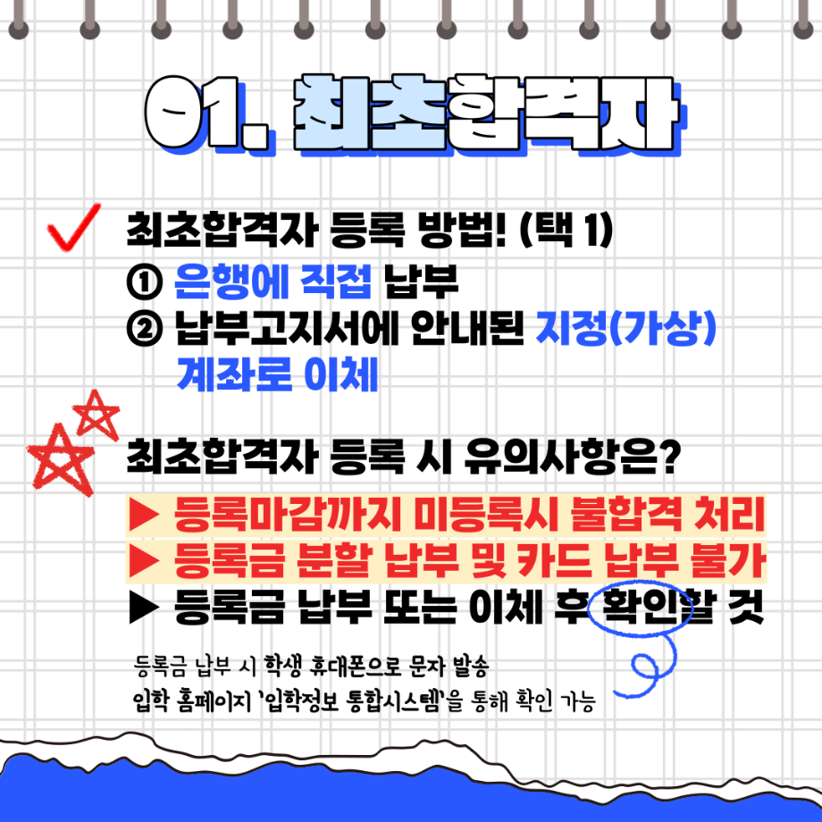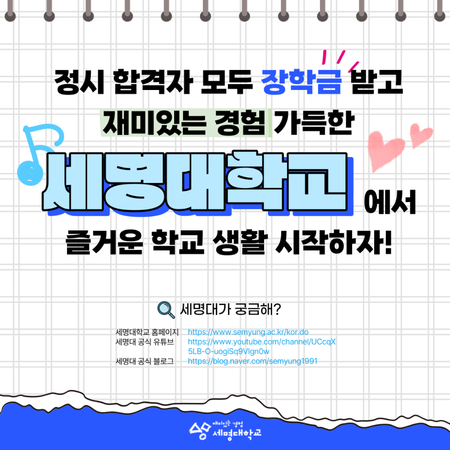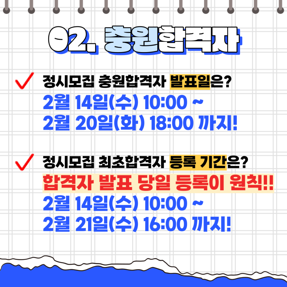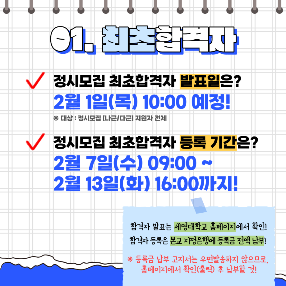 본문 시작 홈으로 SMIT 소식 SMIT 소개 SMIT 교육 SMIT 취업 SMIT 소식 SMIT 입학 홈페이지가이드 갤러리 공지사항 갤러리 경진대회 동아리 갤러리 페이스북 트위터 프린트 세명대학교 2024학년도 정시 합격자 발표 및 등록 일정 총정리💡 스마트IT학부 2814 2024-01-25 세명대학교 2024학년도 정시 합격자 발표 및 등록 일정 총정리💡 안녕하세요. 세명대학교 스마트IT학부입니다. 2024학년도 정시 합격자 발표 및 등록 일정 총정리입니다 😍 정시 발표 및 등록 일정 꼭 확인 하셔서 차질 없으시길 바랍니다. 😊 3월에 세명대학교 스마트IT학부에서 꼭 만나요🥰 목록 이전동계방학 특별활동 “정보처리기사 자격증 특강” 실시!📚 다음 2024학년도 꿈설계학기 라인업 ✨ 담당부서 : 스마트IT학부 담당자 : - 연락처 : 043-649-1275 최종수정일 : 2024-10-26 만족도조사 만족도 조사 이 페이지에서 제공하는 정보에 대하여 만족하시나요? 매우만족 만족 보통 불만족 매우불만족