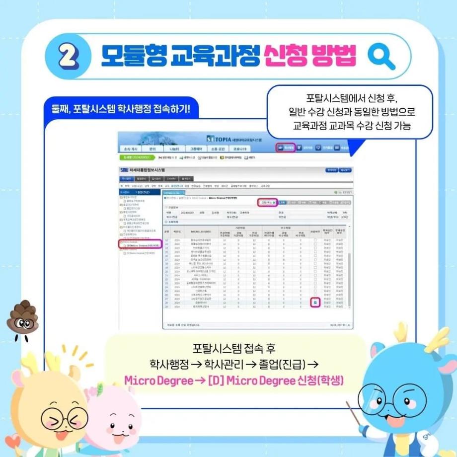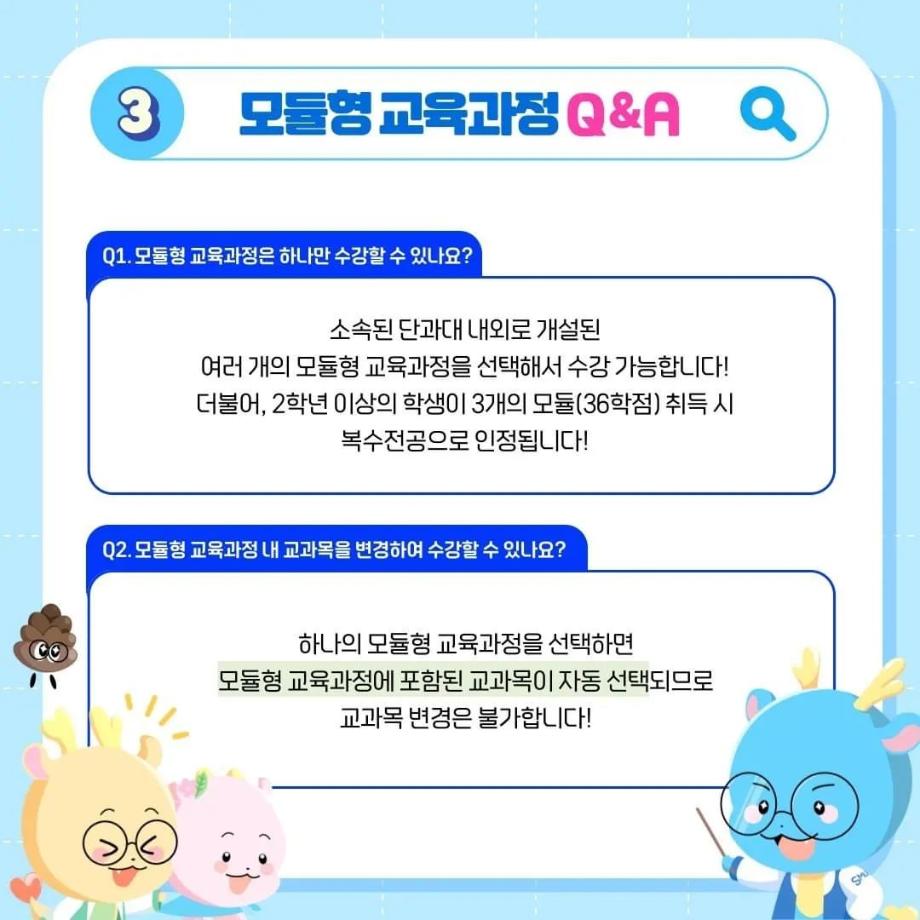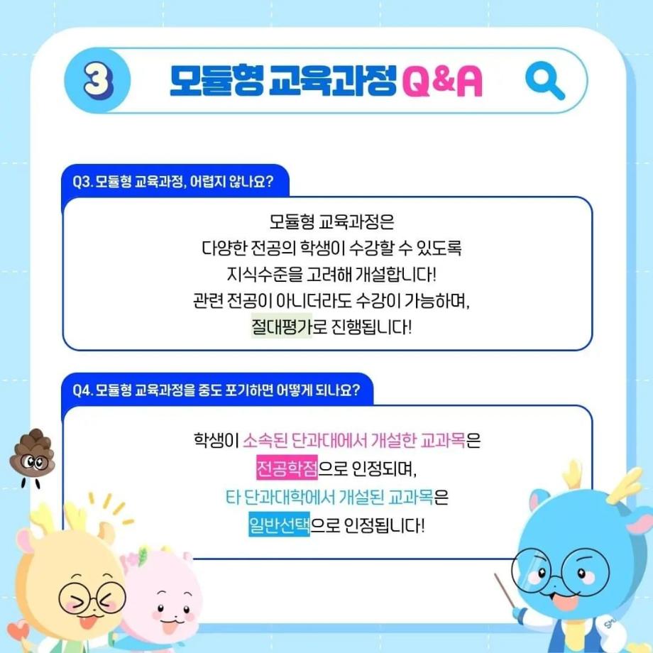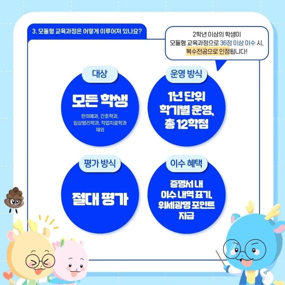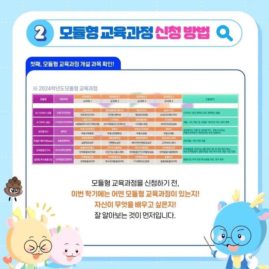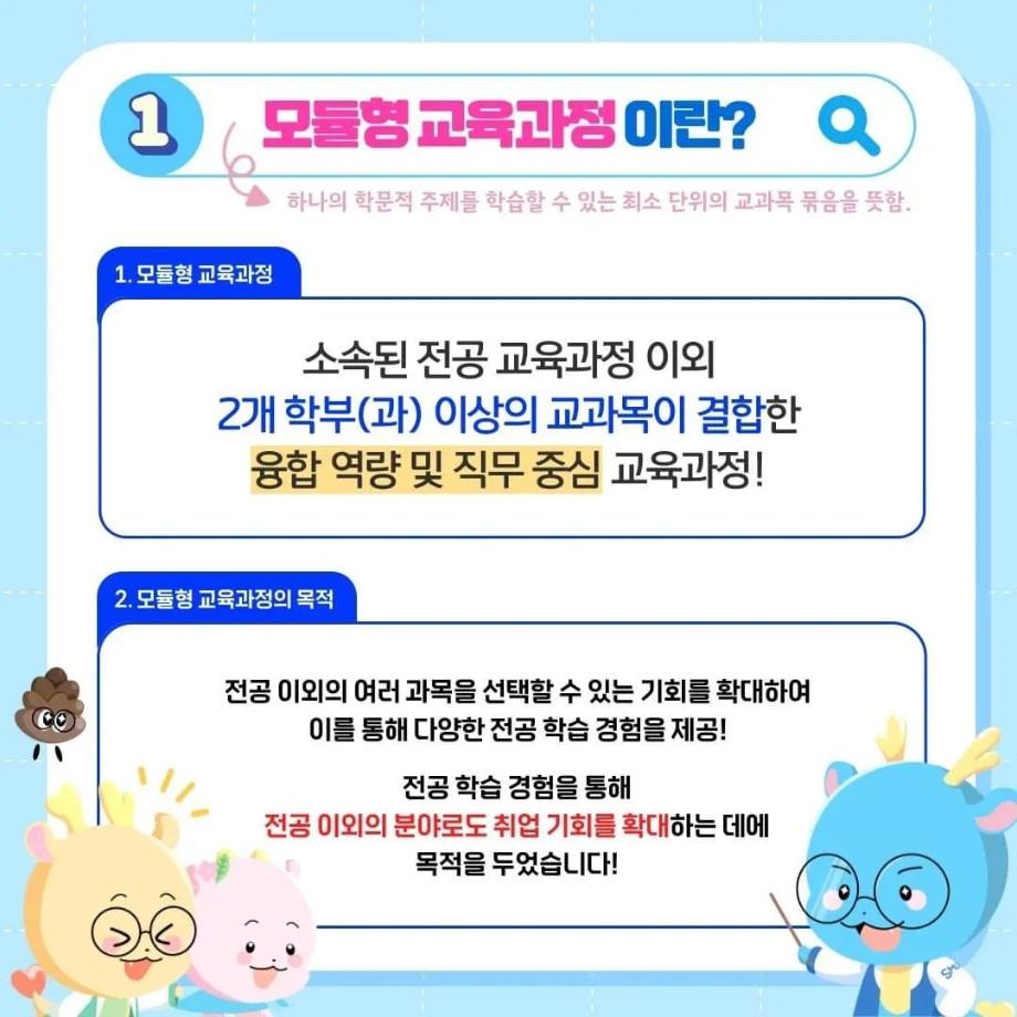 본문 시작 홈으로 SMIT 소식 SMIT 소개 SMIT 교육 SMIT 취업 SMIT 소식 SMIT 입학 홈페이지가이드 갤러리 공지사항 갤러리 경진대회 동아리 갤러리 페이스북 트위터 프린트 ✨모듈형 교육과정✨ 안내 스마트IT학부 2733 2024-03-29 융합인재를 위한 세명대의 새로운 시도, ✨모듈형 교육과정✨ 안내 2024년부터 시행되는 모듈형 교육과정! 2개 학부(과) 이상의 교과목이 결합한 ✔융합 역량 및 직무 중심 교육과정✔으로, 다양한 전공 학습 경험 제공을 통해 전공 이외의 분야로 ✨취업 기회를 확대✨할 수 있습니다! 모듈형 교육과정이 더 궁금하다면? 📞 043) 649-1131, 1135 (세명대학교 교무연구처 학사관리팀) 목록 이전2024학년도 신입생 환영회😀 다음 제천시 전입 장학금 안내 ! 담당부서 : 스마트IT학부 담당자 : - 연락처 : 043-649-1275 최종수정일 : 2024-10-26 만족도조사 만족도 조사 이 페이지에서 제공하는 정보에 대하여 만족하시나요? 매우만족 만족 보통 불만족 매우불만족