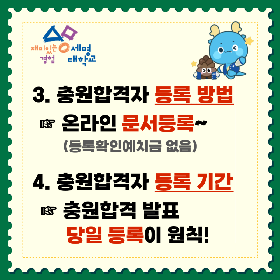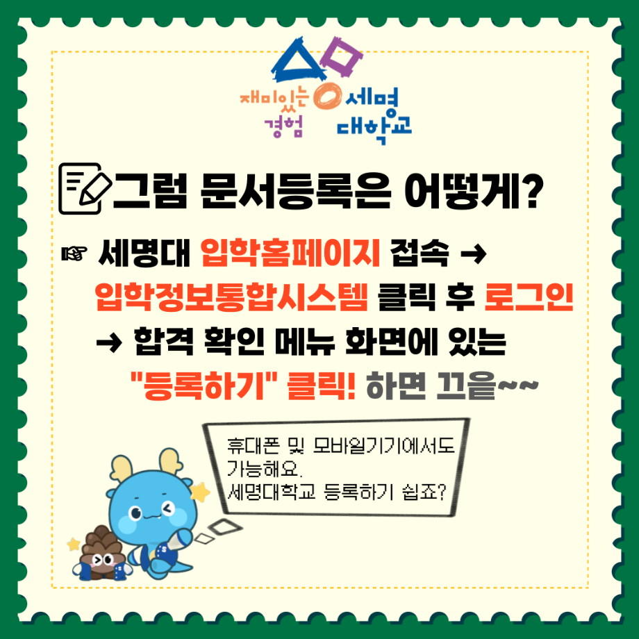 본문 시작 홈으로 SMIT 소식 SMIT 소개 SMIT 교육 SMIT 취업 SMIT 소식 SMIT 입학 홈페이지가이드 갤러리 공지사항 갤러리 경진대회 동아리 갤러리 페이스북 트위터 프린트 2025학년도 수시모집 충원합격자 발표/등록 안내 스마트IT학부 2167 2024-12-19 2025학년도 수시모집 충원합격자 발표/등록 안내 자세한 내용은 세명대학교 입학홈페이지 참고 (https://ipsi.semyung.ac.kr/) 목록 이전수시모집 최초 합격자 발표 안내 다음 📌 2025 학년도 정시모집 안내 📌 담당부서 : 스마트IT학부 담당자 : - 연락처 : 043-649-1275 최종수정일 : 2024-10-26 만족도조사 만족도 조사 이 페이지에서 제공하는 정보에 대하여 만족하시나요? 매우만족 만족 보통 불만족 매우불만족