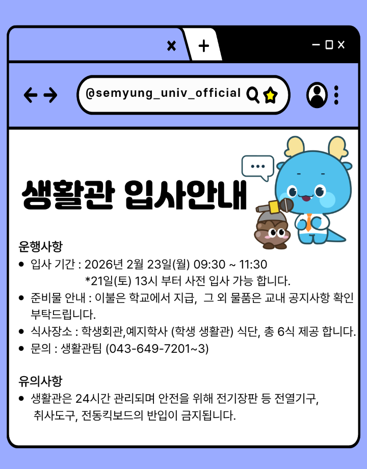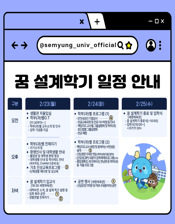본문 시작 홈으로 SMIT 소식 SMIT 소개 SMIT 교육 SMIT 취업 SMIT 소식 SMIT 입학 홈페이지가이드 갤러리 공지사항 갤러리 경진대회 동아리 갤러리 페이스북 트위터 프린트 2026학년도 신입생 '꿈 설계학기오리엔테이션' 시행 안내 스마트IT학부 678 2026-02-13 2026학년도 신입생 '꿈 설계학기오리엔테이션' 시행 안내 목록 이전★ 2026학년도 정시모집 및 편입학모집 최초합격자 발표 일정 안내 ★ 다음 새해복 많이 받으세요! 담당부서 : 스마트IT학부 담당자 : - 연락처 : 043-649-1275 최종수정일 : 2024-10-26 만족도조사 만족도 조사 이 페이지에서 제공하는 정보에 대하여 만족하시나요? 매우만족 만족 보통 불만족 매우불만족