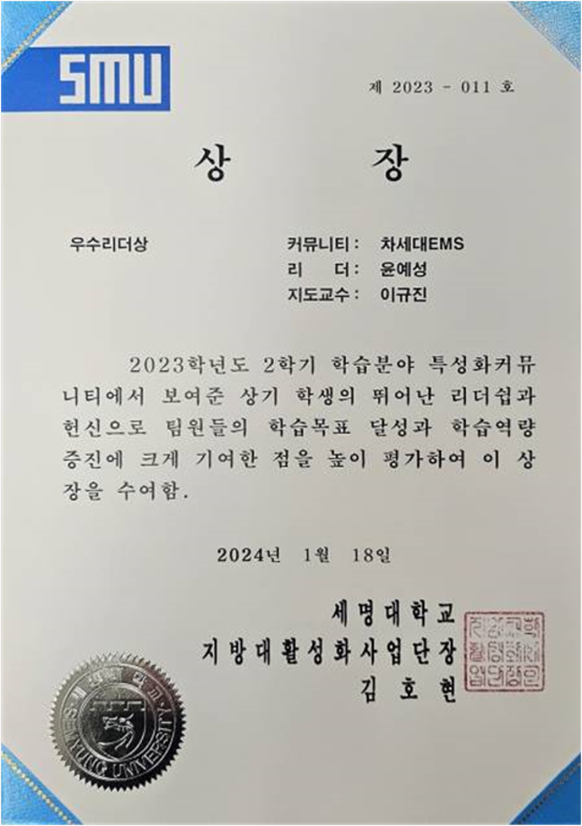 본문 시작 홈으로 커뮤니티 학과소개 교수소개 학과과정 커뮤니티 홈페이지가이드 포토갤러리 학과공지 채용정보 학과일정 포토갤러리 전공자료실 정보자료실 포토갤러리 페이스북 트위터 프린트 [전기, 전자공학과 수상] 2023학년도 특성화 커뮤니티 전기공학과 3632 2024-02-16 전기공학과 우수리더, 전기공학과 최우수 수상 전자공학과 우수 수상 목록 이전청소년 빅 콘서트 홍보부스 사진 다음 세명대학교 전기공학과 캡스톤디자인팀 ‘121호’, 대한전기학회 하계학술대회 스마트에너지경진대회 ‘금상’ 수상 담당부서 : 전기공학과 담당자 : - 연락처 : 043-649-1307 최종수정일 : 2024-10-26 만족도조사 만족도 조사 이 페이지에서 제공하는 정보에 대하여 만족하시나요? 매우만족 만족 보통 불만족 매우불만족