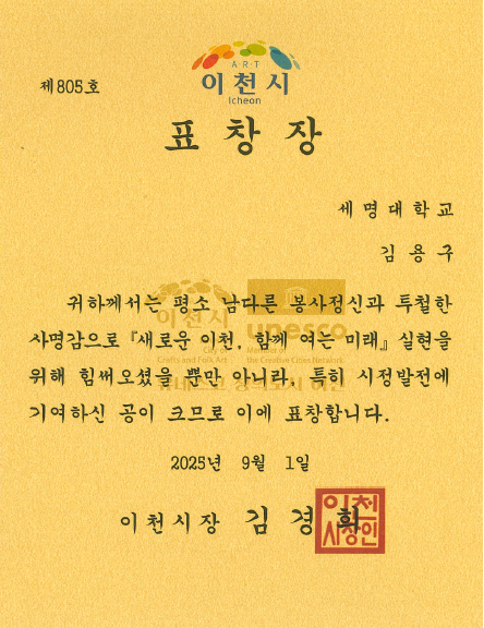 본문 시작 홈으로 교수소개 학과소개 진로 및 취업 교수소개 학과과정 커뮤니티 홈페이지가이드 교수동정 교수소개 교수동정 보건안전연구 언론보도 교수동정 페이스북 트위터 프린트 김용구 교수 이천시장 표창장 수여 보건안전학과 조회 : 490 등록일 : 2025-09-30 남다른 봉사정신과 투철한 사명감으로 이천시 시정발전에 기여한 공으로 이천시장 표창장 수여(제805호) 목록 이전하동명 석좌교수 - 수도권연구안전센터 이사장 취임 다음 하동명 석좌교수 ·양진호교수- 삼성전자(천안사업장) 연구비 지원 담당부서 : 보건안전학과 담당자 : - 연락처 : 043-649-1777 최종수정일 : 2024-10-26 만족도조사 만족도 조사 이 페이지에서 제공하는 정보에 대하여 만족하시나요? 매우만족 만족 보통 불만족 매우불만족