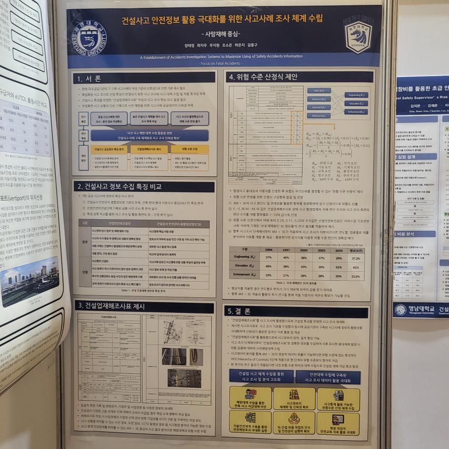 본문 시작 홈으로 커뮤니티 학과소개 진로 및 취업 교수소개 학과과정 커뮤니티 홈페이지가이드 포토갤러리 학과공지 학사일정 포토갤러리 학생회 학과영상 보건안전학과 인스타 보건안전학과 블로그 포토갤러리 페이스북 트위터 프린트 2023년 한국건설관리학회 주최 "정기학술발표대회"참가하여 장려상 수상 (학생 : 장태정(4학년), 최지우(4학년), 우지원(4학년), 조소은(4학년), 하은지(3학년) - 지도교수 : 김용구) 보건안전학과 3431 2023-11-10 2023년 한국건설관리학회 주최 "정기학술발표대회"에 참가 "전국 대학생 학술발표대회 부문에서"에서 장려상 수상 - 학회명 : 한국건설관리학회 - 일시 : 2023 11.3(금), 강원도 고성 소노캄 델피노 - 논문명 : 건설사고 안전정보 활용 극대화를 위한 사고사례 조사체계 수립(사망재해 중심) - 연구참여자 : 장태정(4학년), 최지우(4학년), 우지원(4학년), 조소은(4학년), 하은지(3학년) - 지도교수 : 김용구 목록 이전2023년도 (사)대한설비관리학회 제28회 학술발표대회 세명대 보건안전학과 최우수상(2등) 수상 다음 제4회 보건바이오대학 charm경험발표회 담당부서 : 보건안전학과 담당자 : - 연락처 : 043-649-1777 최종수정일 : 2024-10-26 만족도조사 만족도 조사 이 페이지에서 제공하는 정보에 대하여 만족하시나요? 매우만족 만족 보통 불만족 매우불만족