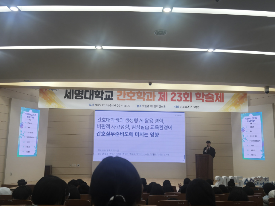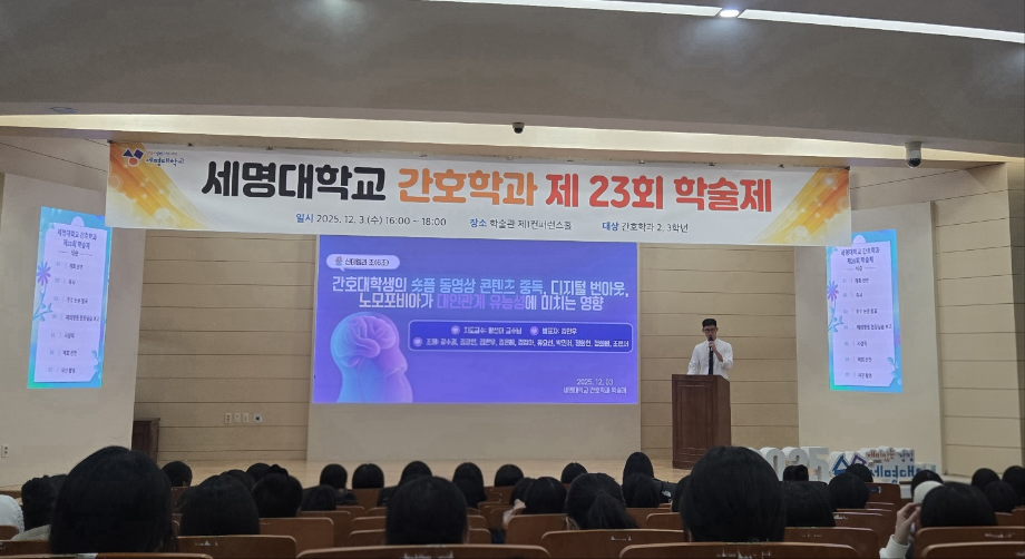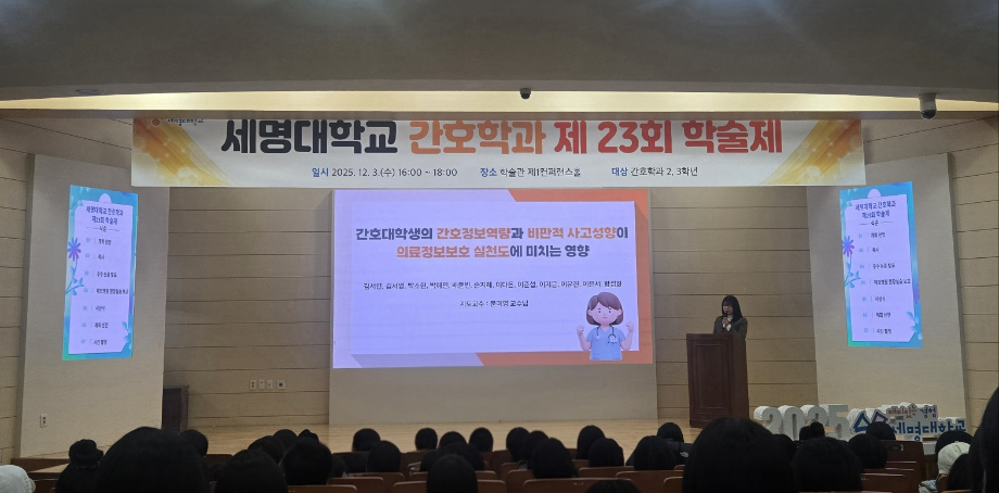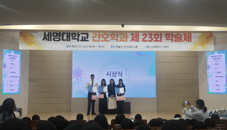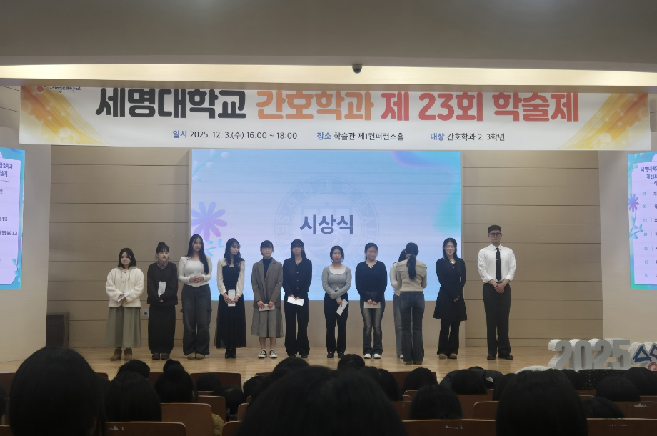 본문 시작 홈으로 커뮤니티 학과소개 교수소개 교육과정 학과소식 학과특성화 사업 커뮤니티 홈페이지가이드 포토갤러리 학사일정 포토갤러리 학생회 학과동아리 학과 취업정보 동창회 학과운영개선의견 발전기금 포토갤러리 페이스북 트위터 프린트 제 23회 간호학과 학술제 간호학과 2046 2025-12-08 12/3 진행된 📝 2024 학술제 발표와 ✈ 해외 인턴십 경험 공유 후기가 학과 블로그에 업로드되었습니다. 발표 현장과 생생한 경험담이 궁금하다면 아래 링크를 확인해주세요 👇 🔗 링크 https://blog.naver.com/nursing_smu_official/224099825798 목록 이전📍 ‘임상실습 안전사고 ZERO를 위하여’ 특강 다음 세명대학교 간호학과 제66회 간호사 국가시험 임장지도 실시 담당부서 : 간호학과 담당자 : - 연락처 : 043-649-1357 최종수정일 : 2024-10-26 만족도조사 만족도 조사 이 페이지에서 제공하는 정보에 대하여 만족하시나요? 매우만족 만족 보통 불만족 매우불만족