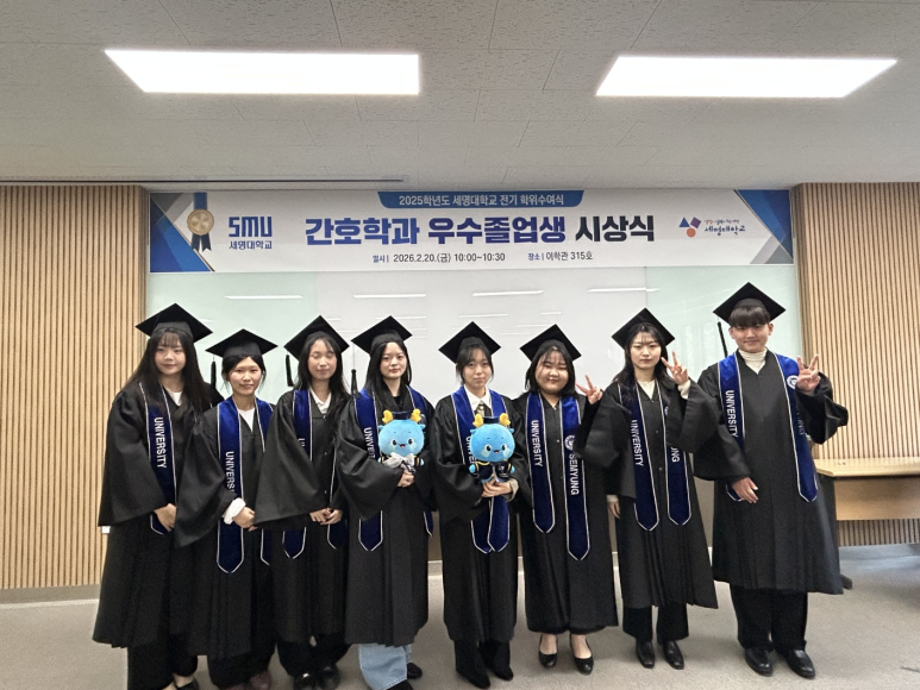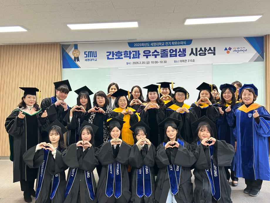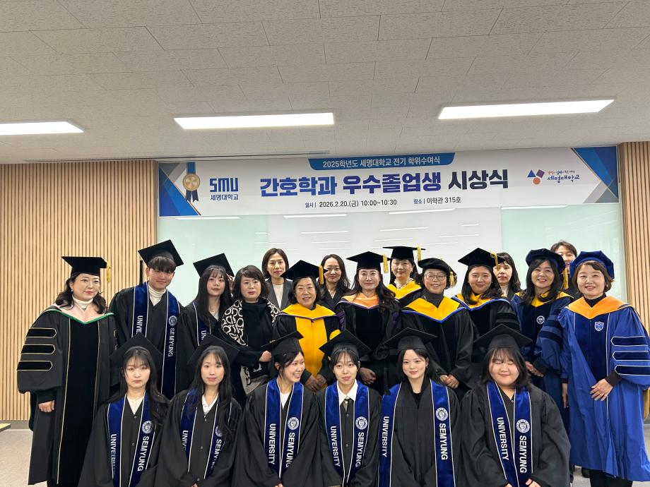 본문 시작 홈으로 커뮤니티 학과소개 교수소개 교육과정 학과소식 학과특성화 사업 커뮤니티 홈페이지가이드 포토갤러리 학사일정 포토갤러리 학생회 학과동아리 학과 취업정보 동창회 학과운영개선의견 발전기금 포토갤러리 페이스북 트위터 프린트 2025학년도 세명대학교 간호학과 학위수여식🎓 간호학과 990 2026-02-23 세명대학교 간호학과 졸업생들은 2025학년도 학위수여식을 통해 4년간의 배움과 성장을 마무리하고 새로운 출발선에 섰습니다. 빛나는 졸업의 순간이 담긴 현장이 궁금하시다면, 아래 링크를 클릭해 주세요. 👉 [학위수여식 현장 보러가기] https://blog.naver.com/nursing_smu_official/224192111491 목록 이전세명대학교 간호학과 제66회 간호사 국가시험 임장지도 실시 다음 2026학년도 꿈설계학기 담당부서 : 간호학과 담당자 : - 연락처 : 043-649-1357 최종수정일 : 2024-10-26 만족도조사 만족도 조사 이 페이지에서 제공하는 정보에 대하여 만족하시나요? 매우만족 만족 보통 불만족 매우불만족