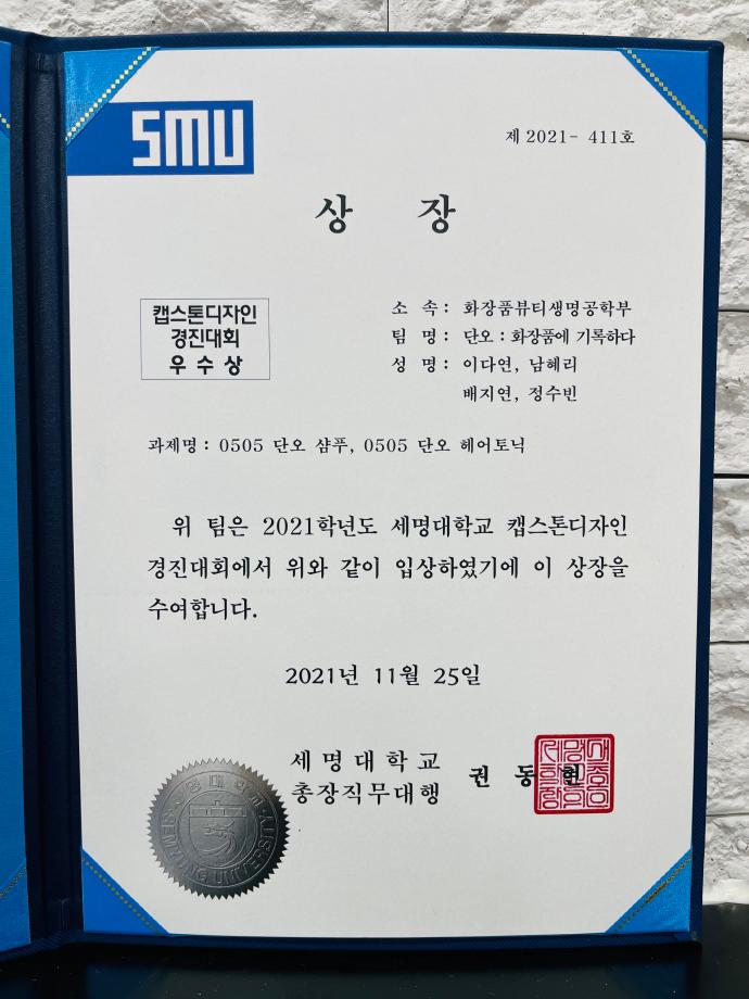 본문 시작 홈으로 커뮤니티 학과소개 학과과정 대학원 커뮤니티 연구동아리 홈페이지가이드 포토갤러리 학과공지 채용정보 학과일정 포토갤러리 유튜브 인스타그램 취업현황 학생회 조직도 졸업생 숏터뷰 포토갤러리 페이스북 트위터 프린트 2021학년도 캡스톤디자인 경진대회 입상_단오 팀 화장품뷰티학부 3624 2021-12-20 2021학년도 세명대학교 캡스톤디자인 경진대회에서 우리 화장품학부 '단오' 팀에서 우수상을 받았습니다. 입상 축하드립니다 :) 목록 이전2021 대학혁신지원사업 연구역량 강화 프로그램 포스터 게시 다음 세명대학교 화장품뷰티학부 2022학년도 정시모집 안내 담당부서 : 바이오코스메틱학과 담당자 : - 연락처 : 043-649-1638 최종수정일 : 2024-10-26 만족도조사 만족도 조사 이 페이지에서 제공하는 정보에 대하여 만족하시나요? 매우만족 만족 보통 불만족 매우불만족