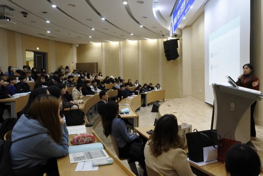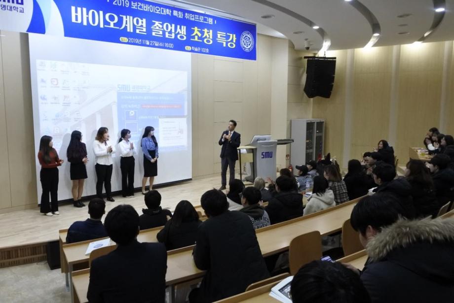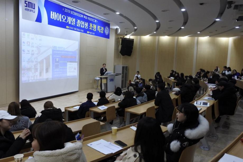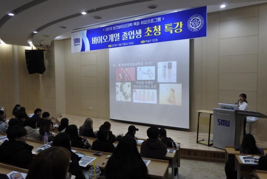 보건바이오대학(학장 고성권) 특화취업프로그램 일환으로 화장품뷰티생명공학부 졸업생 초청 강연회가 2019. 11. 27(수) 학술관 102호 대회의실에서 개최되었습니다.