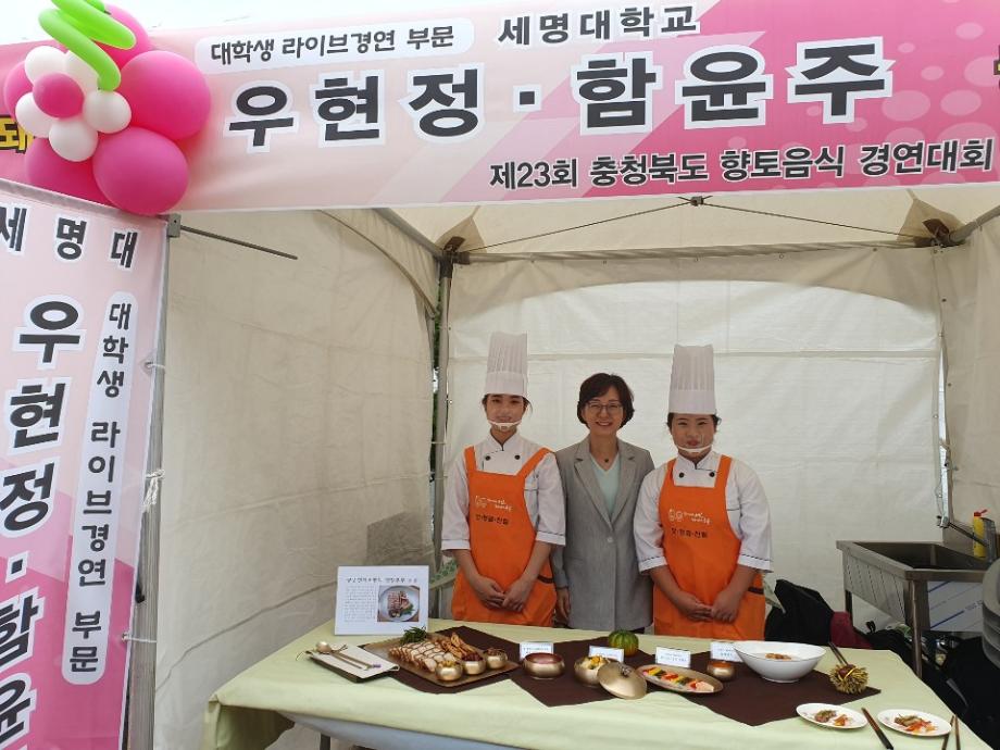 바이오식품산업학부 3학년 우현정, 함윤주 학생이 9월 20일 충청북도와 충북MBC에서 주최하는 제23회 충청북도 향토음식 경연대회에 출전하여 금상을 수상하였다. 충청북도 향토음식 경연대회는 지역의 특색있는 향토음식을 적극 발굴하고 충북의 음식을 널리 홍보하기 위하여 개최되었으며, 학생들은 돼지고기를 이용한 요리가 주제인 ‘대학생 라이브경연 부문’에서 ‘궁중연저육’을 약선의 개념으로 창작하여 출품하였다. 출품작은 심사위원들과 현장에 참가한 많은 시민들로부터 좋은 반응을 얻었고 참가한 학생들은 신메뉴 개발과 라이브 쇼의 도전 경험으로 많은 자신감을 얻었다고 전했다.