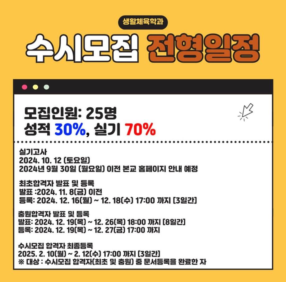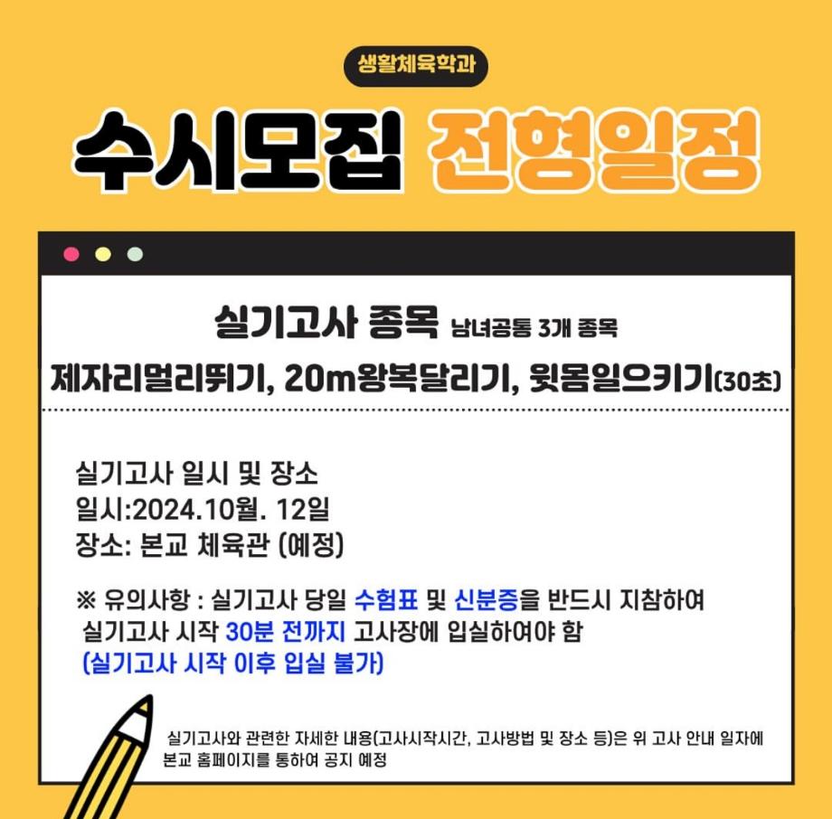 본문 시작 홈으로 커뮤니티SNS 학과소개 진로취업사례 입학안내 교육과정 커뮤니티SNS 홈페이지가이드 학과행사갤러리 학과공지 열린정보SNS 학과동아리 학과행사갤러리 학과MOU 학생회조직도 학과연혁 동문회조직도 학과행사갤러리 페이스북 트위터 프린트 생활체육학과 2025학년도 수시모집 실기고사 생활체육학과 2518 2024-10-07 생활체육학과 2025학년도 수시모집 실기고사 목록 이전2024학년도 1학년 축구 수업 팀별 단체사진 다음 2024학년도 총장배 대비 축구, 피구 연습 담당부서 : 생활체육학과 담당자 : - 연락처 : 043-469-1289 최종수정일 : 2024-10-26 만족도조사 만족도 조사 이 페이지에서 제공하는 정보에 대하여 만족하시나요? 매우만족 만족 보통 불만족 매우불만족