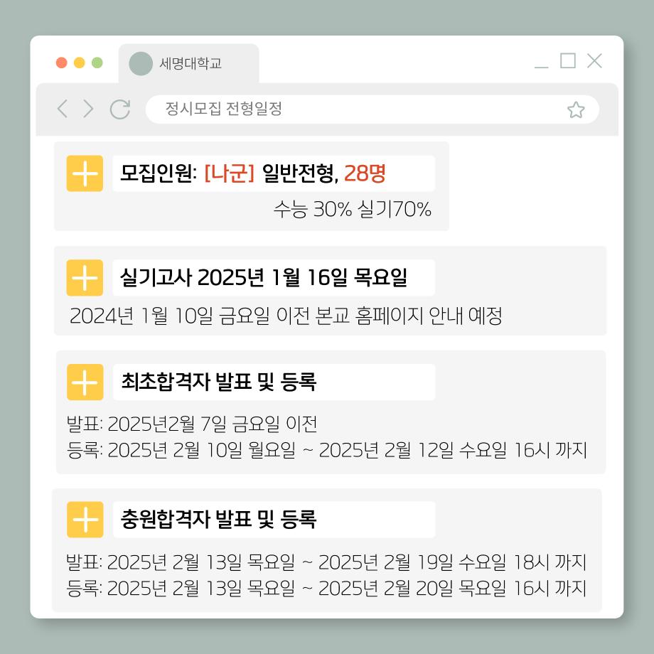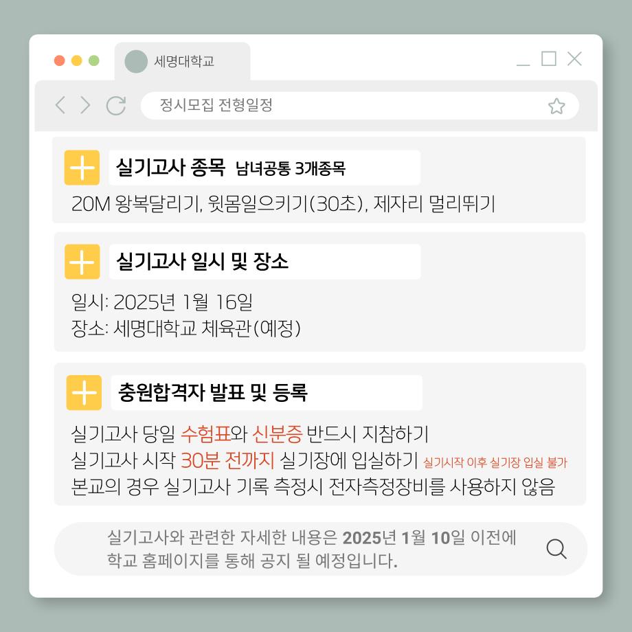 본문 시작 홈으로 커뮤니티SNS 학과소개 진로취업사례 입학안내 교육과정 커뮤니티SNS 홈페이지가이드 학과행사갤러리 학과공지 열린정보SNS 학과동아리 학과행사갤러리 학과MOU 학생회조직도 학과연혁 동문회조직도 학과행사갤러리 페이스북 트위터 프린트 2025학년도 정시 실기고사 생활체육학과 3252 2025-01-09 2025학년도 세명대학교 생활체육학과 정시모집 전형일정 및 실기고사 안내입니다 ! 목록 이전2024학년도 동계스포츠 다음 2025학년도 정시 실기고사 시행 담당부서 : 생활체육학과 담당자 : - 연락처 : 043-469-1289 최종수정일 : 2024-10-26 만족도조사 만족도 조사 이 페이지에서 제공하는 정보에 대하여 만족하시나요? 매우만족 만족 보통 불만족 매우불만족