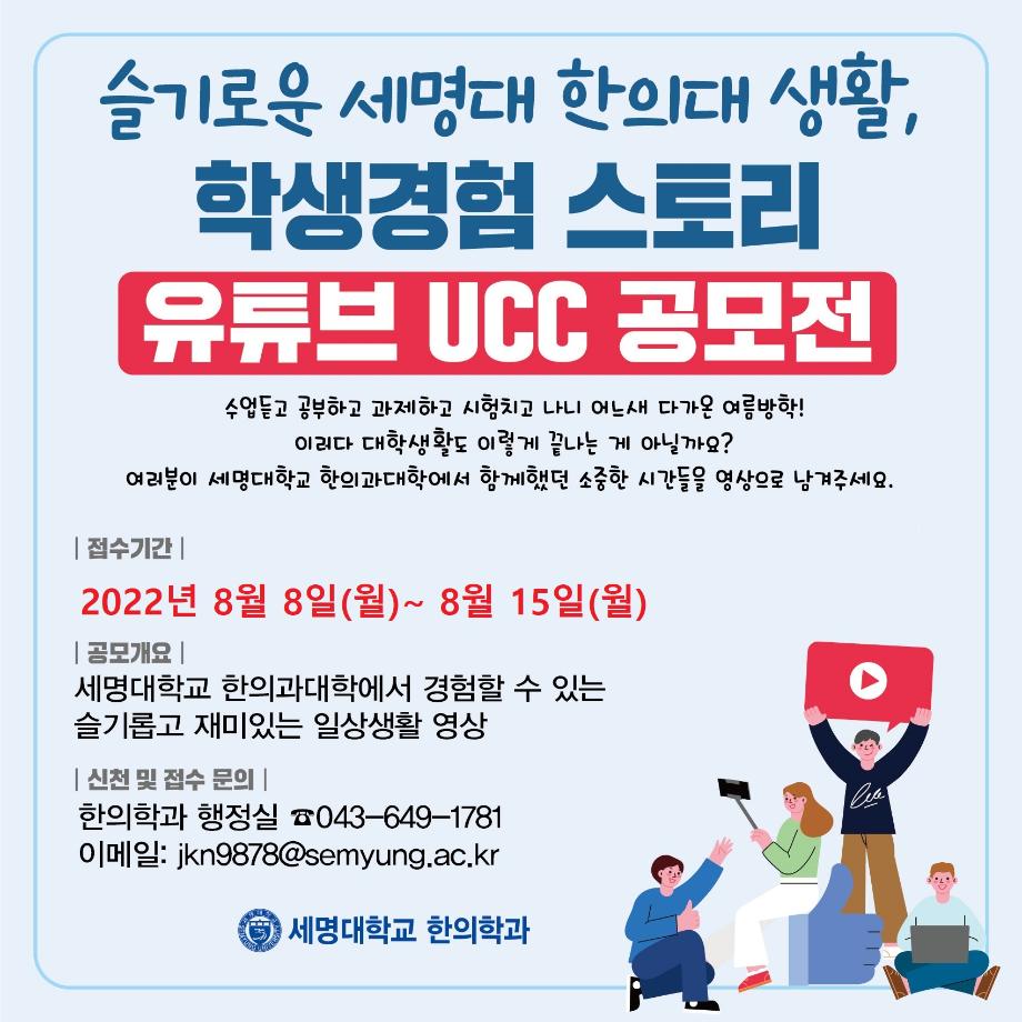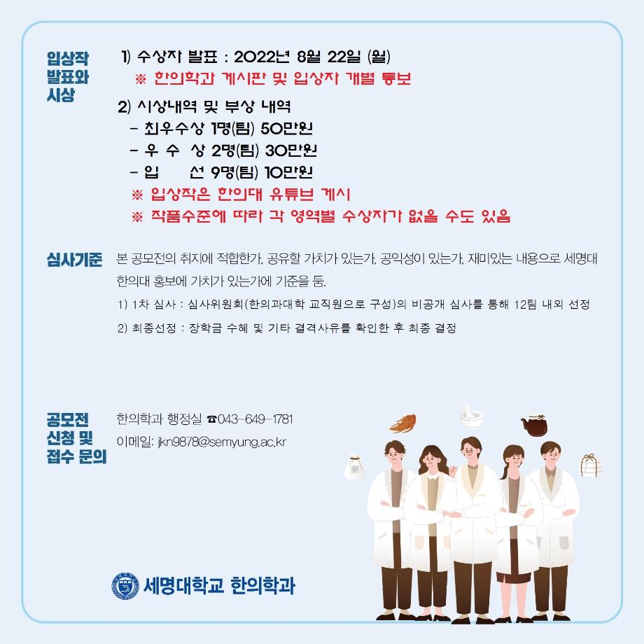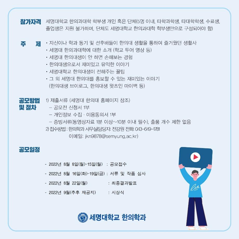 본문 시작 홈으로 대학소식 대학소개 교수소개 대학과정 커뮤니티 대학원 대학소식 홈페이지가이드 포토갤러리 학과공지 포토갤러리 발전기금 위원회 관련사이트 포토갤러리 페이스북 트위터 프린트 슬기로운 한의대 생활 학생경험 스토리 유튜브 UCC 공모전 한의과대학 3076 2022-07-01 슬기로운 한의대 생활 학생경험 스토리 유튜브 UCC 공모전 접수기간 : 2022.08.08(월) ~ 2022.08.15(월) 신청 및 접수 : 한의학과 행정실 (043-649-1781) 이메일 주소 : jkn9878@semyung.ac.kr 목록 이전[중등교육 연계프로그램] 충주 대원고등학교 특강 다음 <2022년 7월 1일자 한의과대학 보직 임명사항 안내> 담당부서 : 한의과대학 담당자 : - 연락처 : 043-649-1701 최종수정일 : 2024-10-26 만족도조사 만족도 조사 이 페이지에서 제공하는 정보에 대하여 만족하시나요? 매우만족 만족 보통 불만족 매우불만족