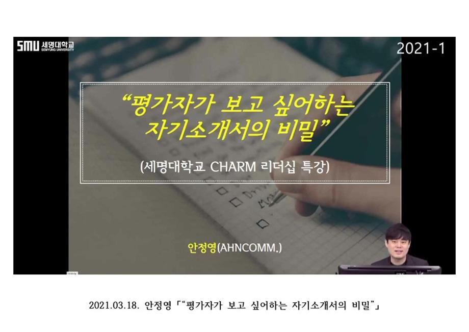 본문 시작 홈으로 커뮤니티 게시판 대학소개 교수소개 교양교육과정 교양교육 프로그램 커뮤니티 게시판 입학안내 홈페이지가이드 자료실 공지사항 자료실 학생 커뮤니티 취업정보 CHARM리더십특강 CHARM리더십특강 CHARM커뮤니케이션 제천문화탐방과 스토리텔링 CHARM인문학콘서트~2018 향토문화탐방~2018 특강 및 기타 행사 포토 갤러리 CHARM리더십특강 페이스북 트위터 프린트 2021- 1학기 CHARM리더십 특강 1-7주차 강의 교양대학 3614 2021-04-30 1주차_"차이"를 넘어 "차별"없는 세상으로_정진화 2주차_나의 강점과 진로 연결하기_나윤숙 3주차_평가자가 보고싶어하는 자기소개서의 비밀_안정영 4주차_진로는 직업선택이 아니라 방향을 선택하는 것이다_김창 5주차_영향력을 돈으로 바꾸는 기술_박세인 6주차_집 나간 멘탈을 찾아드립니다_이영희 7주차_빅데이터와 데이터 리터러시_이상준 목록 이전2020- 2학기 CHARM 리더십 특강 9-14주차 강의 다음 2021- 1학기 CHARM리더십특강 9-14주차 강의 담당부서 : 교양대학 담당자 : - 연락처 : 043-649-7065 최종수정일 : 2024-10-26 만족도조사 만족도 조사 이 페이지에서 제공하는 정보에 대하여 만족하시나요? 매우만족 만족 보통 불만족 매우불만족