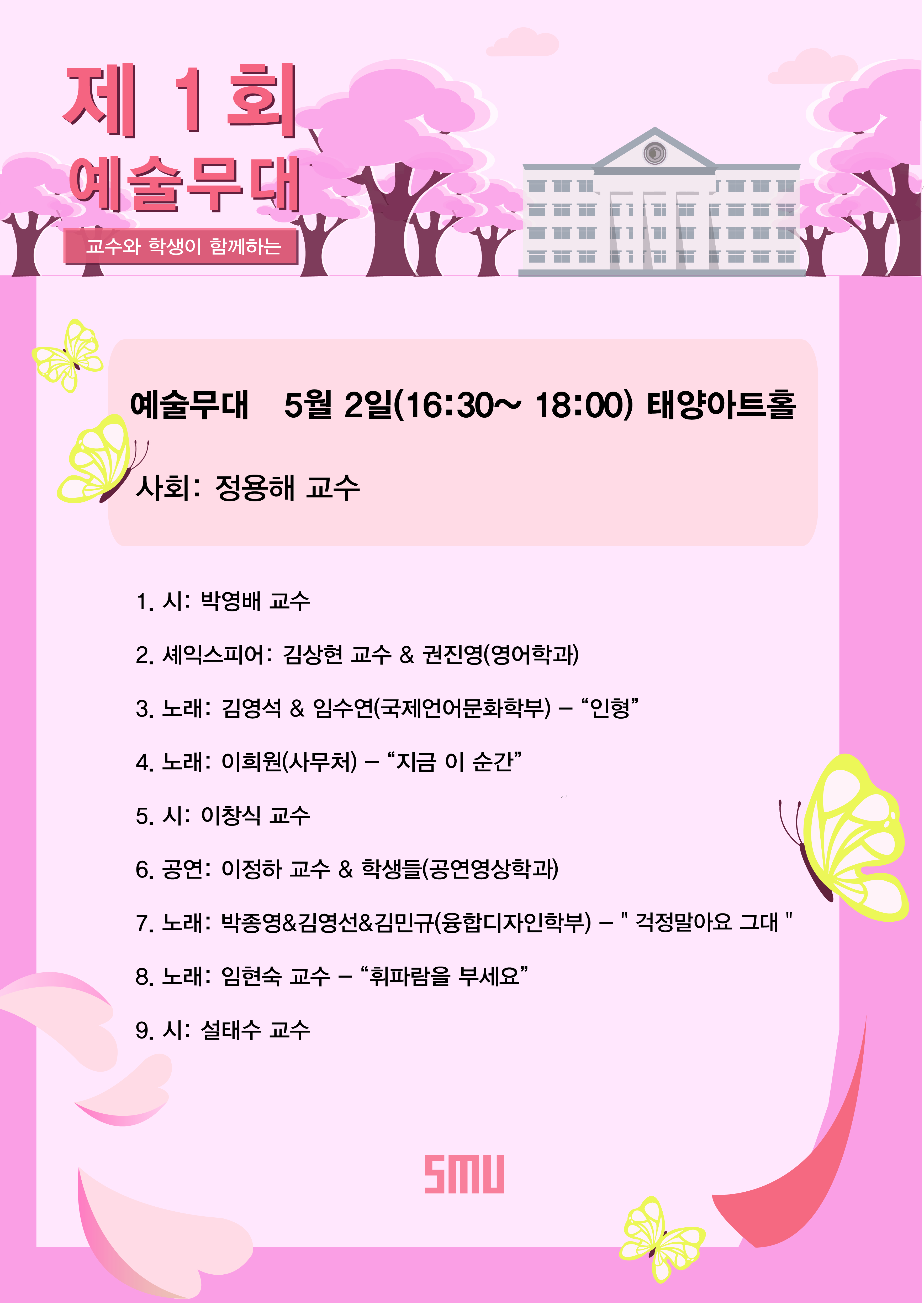 본문 시작 홈으로 커뮤니티 대학소개 학과소개 입학안내 커뮤니티 홈페이지가이드 사진 자료실 대학소식 학과소식 자료실 사진 자료실 동영상 자료실 사진 자료실 페이스북 트위터 프린트 제1회 교수와 학생이 함께하는 예술무대 인문예술대학 7077 2018-04-27 제1회 교수와 학생이 함께하는 예술무대 날짜 : 2018학년 5월 2일 수요일 장소 : 공학관 5층 태양아트홀 시간 : 16:30~18:00 목록 이전[융합디자인학부] 시각디자인 전공 신희경 교수 일본 닛본대학 지원 갤러리에서 전시회 개최 다음 제1회 교수와 학생이 함께하는 예술무대 사진 담당부서 : 인문예술대학 담당자 : - 연락처 : 043-649-7402 최종수정일 : 2024-10-26 만족도조사 만족도 조사 이 페이지에서 제공하는 정보에 대하여 만족하시나요? 매우만족 만족 보통 불만족 매우불만족