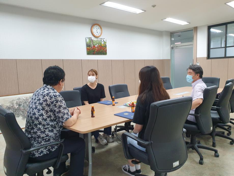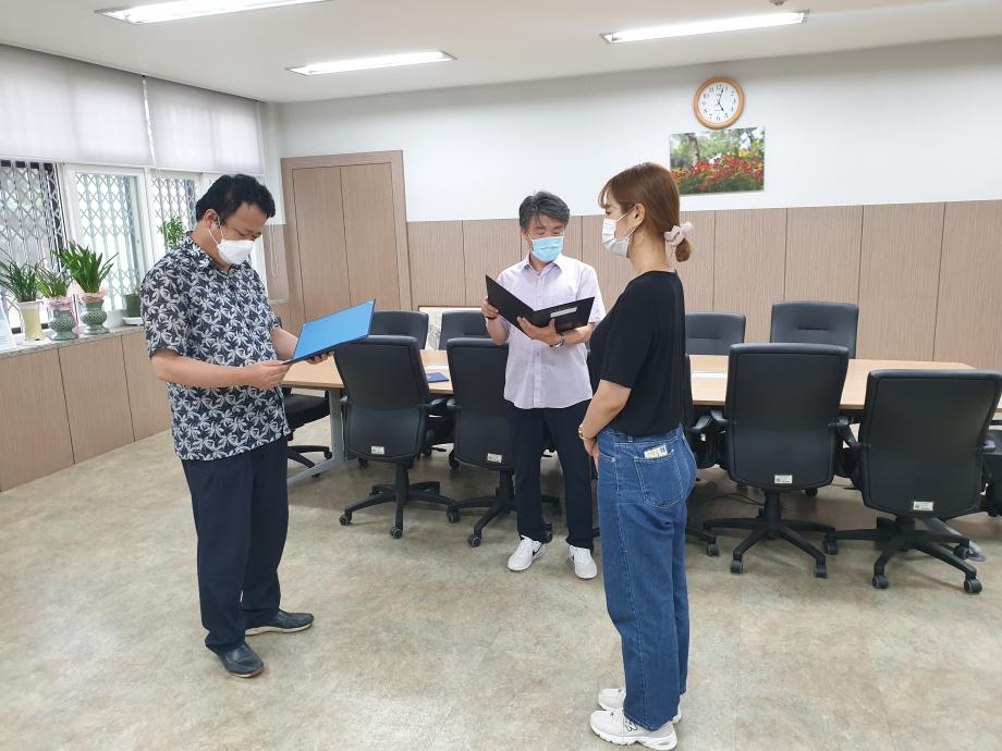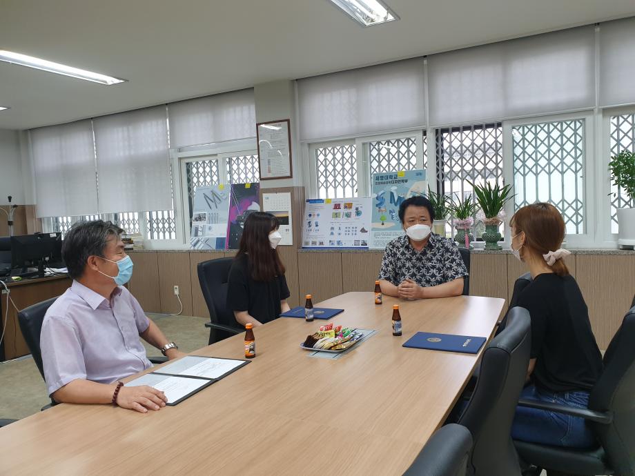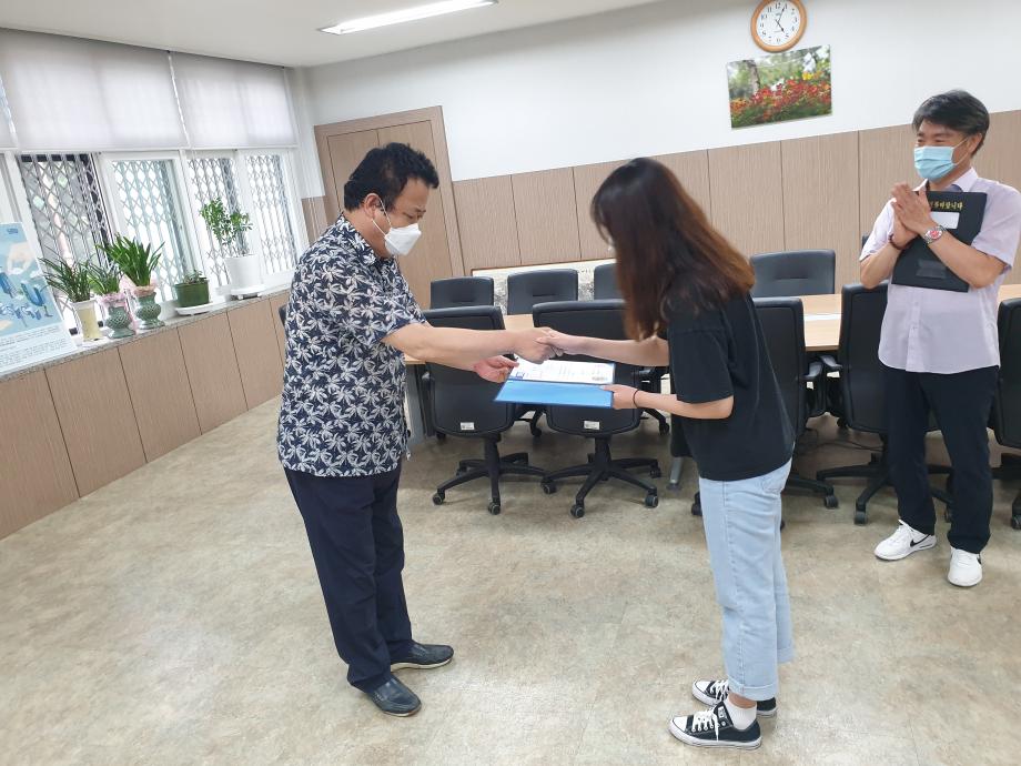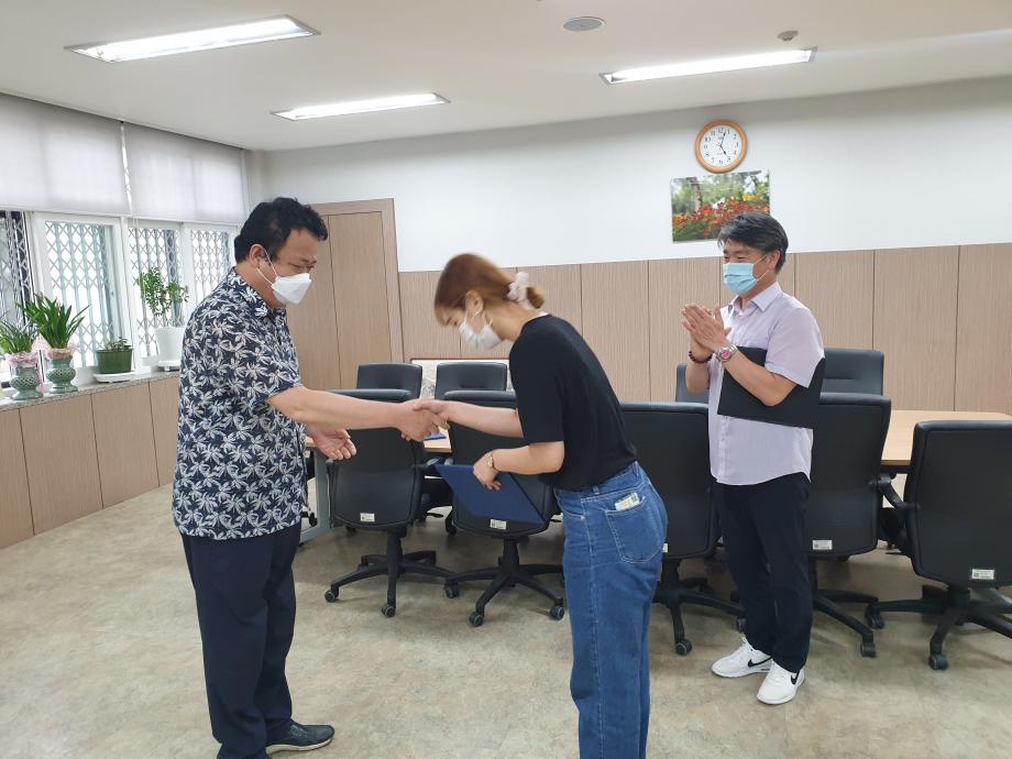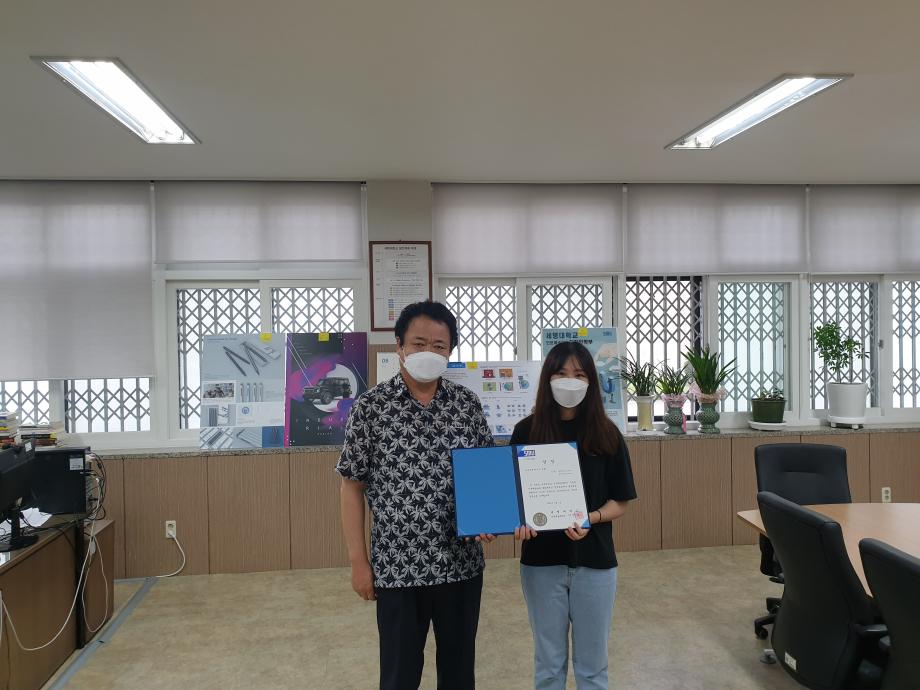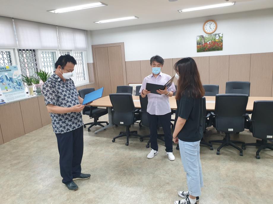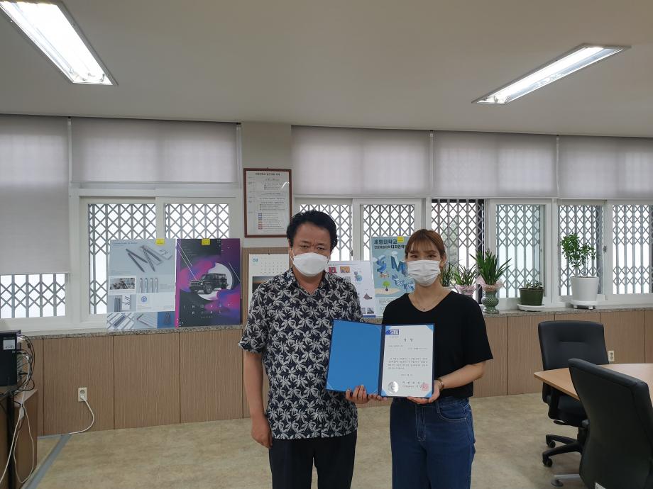 2020학년도 인문예술대학 문화콘텐츠 시상식이 2학기 첫 개강날인 8월 31일 17시 인문예술대학장실에서 거행되었다. 당초 9월1일 시상식 예정이었으나 코로나19로 인하여 UCC부문 최우상 (디지털콘텐츠학과 함경희)과 디자인부문 최우수상(실내디자인 권은진, 김나영)만 시상하게 되었다. 세명대학교 홍보와 학부/ 학과 홍보, 청년미래를 주제로 한 이번 문화콘텐츠 수상작은 실용적인 아이디와 톡톡 튀는 재기발랄한 영상으로 최우수상의 영예를 안게 되었다. 2학기 개강 첫 날 시상식을 거행하여 인예대의 힘찬 2학기 생활을 기대해본다.
