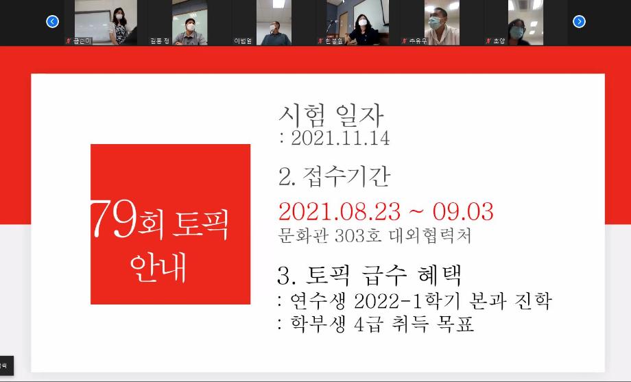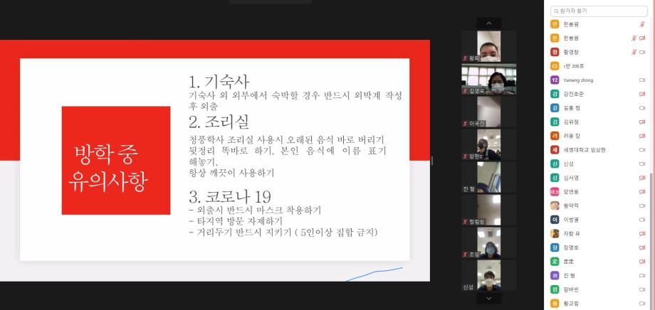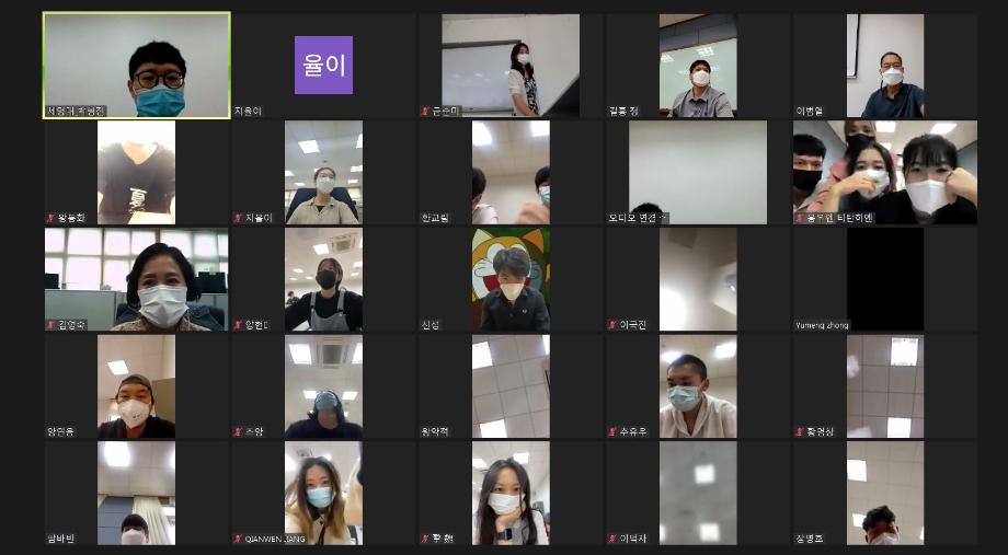 본문 시작 2021-여름 한국어연수생 종강식 국제교육원 2317 2021-08-13 2021-여름 한국어연수생 종강식 코로나19로 인해 비대면 종강식을 실시하였습니다. 목록 이전2021-여름 생활적응지원프로그램 다음 2021-가을학기 신입생 오리엔테이션 담당부서 : 국제교육원 담당자 : - 연락처 : 043-649-1185 최종수정일 : 2024-10-26 만족도조사 만족도 조사 이 페이지에서 제공하는 정보에 대하여 만족하시나요? 매우만족 만족 보통 불만족 매우불만족