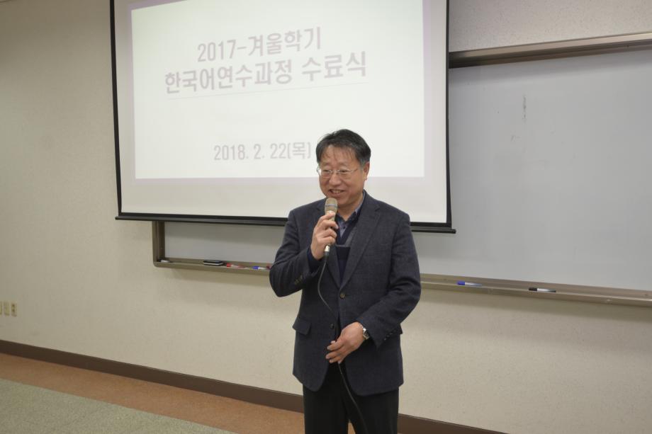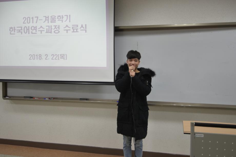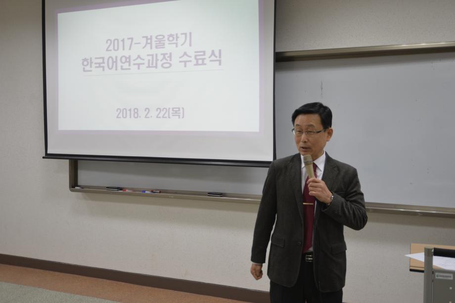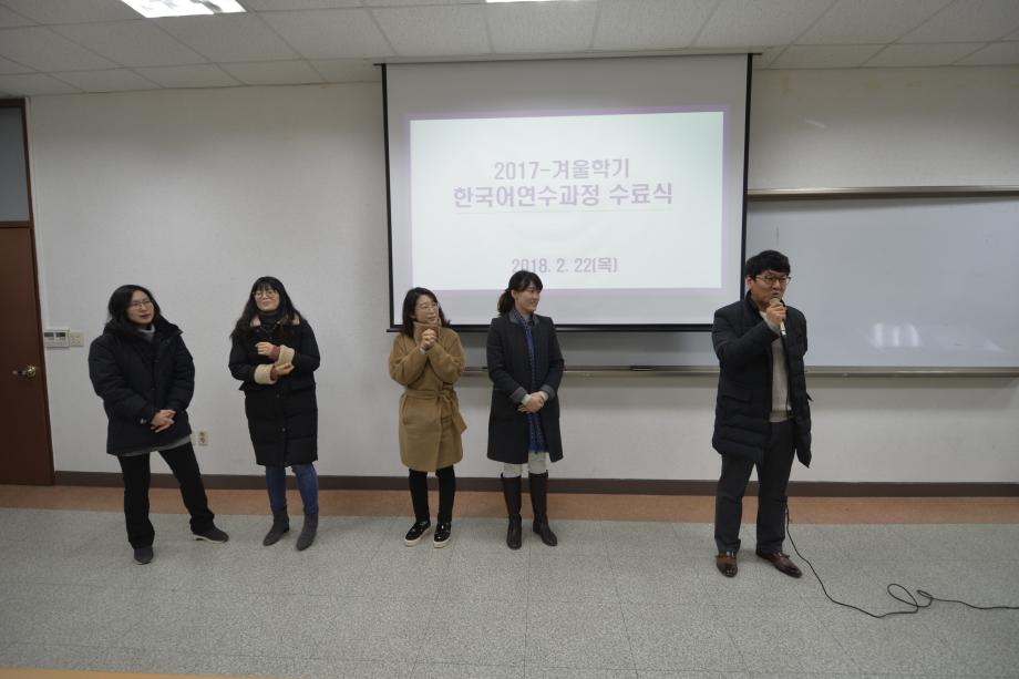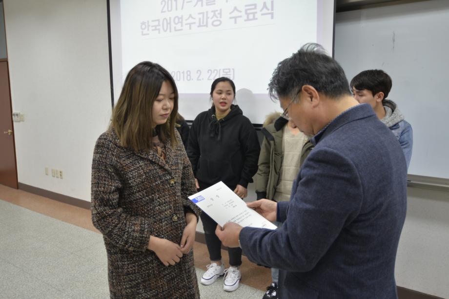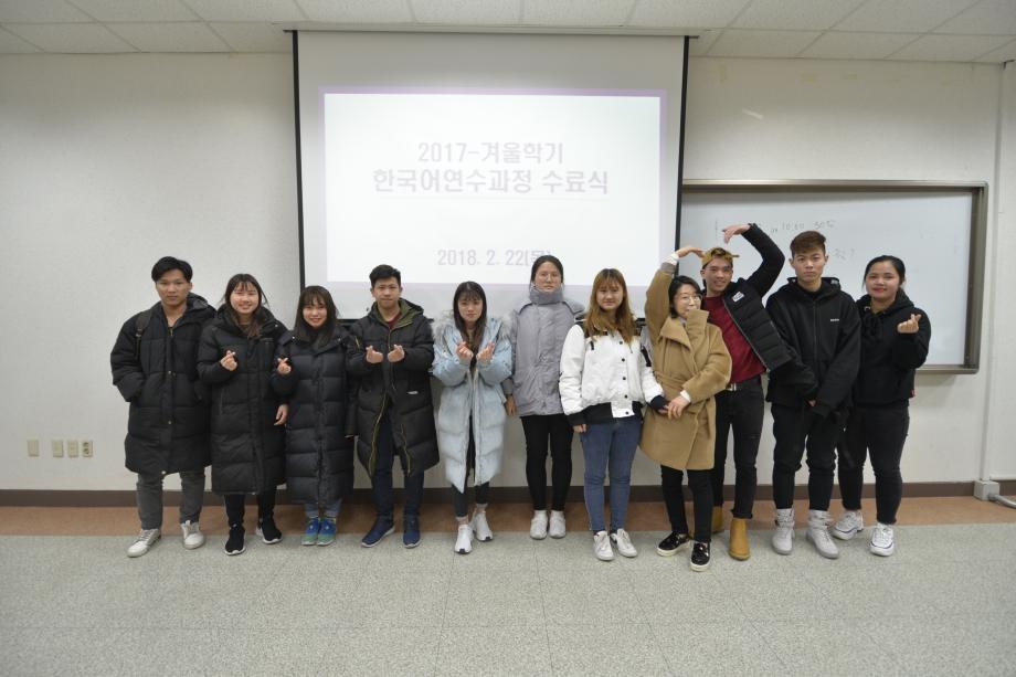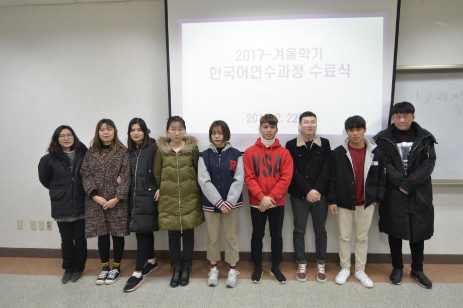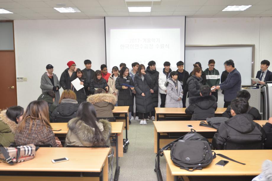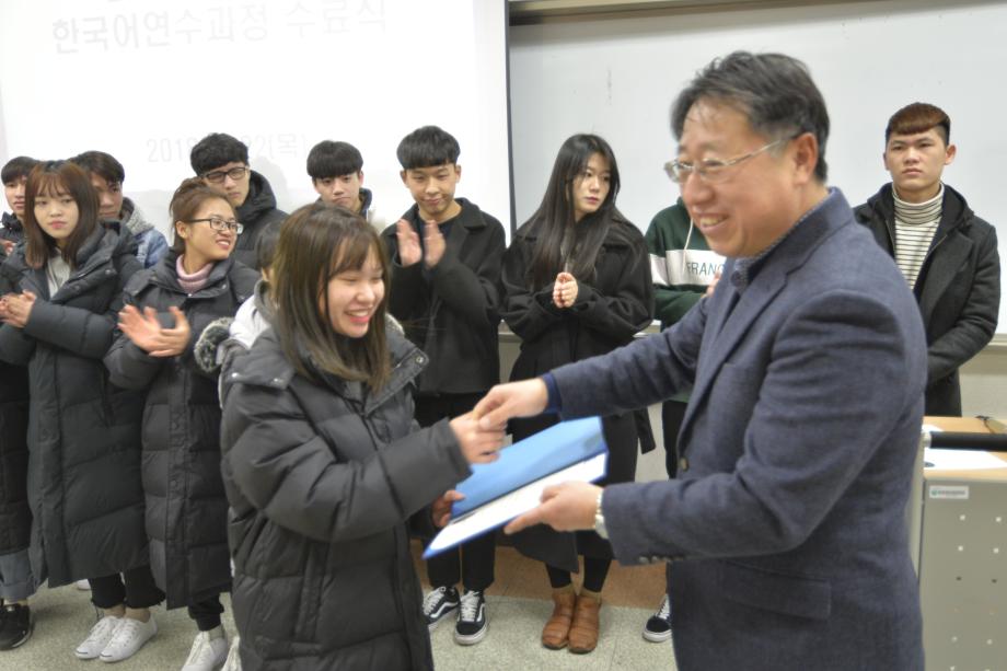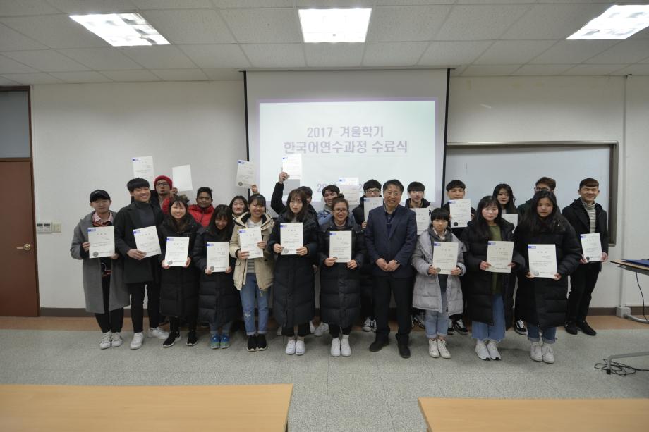 본문 시작 2017년 겨울학기 한국어 연수과정 수료식 국제교육원 5384 2018-02-22 2018년 02월 22일 국제교육원(처장 김창한)에서는 2017-겨울학기 한국어 연수과정 수료식을 진행하였습니다. 연수생들은 한 학기동안 많은 노력을 통해 TOPIK(한국어능력시험) 자격증 취득, 우수학생에 선정되는 등 학업성취를 이루었습니다. 본과에 진학하는 학생들과 연수과정이 남은 학생들 모두 더욱 정진하는 자세를 통해 발전하기를 기원합니다. 목록 이전2017 겨울학기 한국어연수생 설맞이 간담회 다음 2018 봄학기 한국어 연수과정 개강식 담당부서 : 국제교육원 담당자 : - 연락처 : 043-649-1185 최종수정일 : 2024-10-26 만족도조사 만족도 조사 이 페이지에서 제공하는 정보에 대하여 만족하시나요? 매우만족 만족 보통 불만족 매우불만족