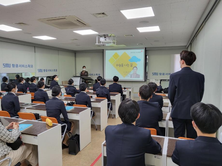 지난 3월 29일 세명대학교 항공서비스학과에서는 아시아나항공에서 6년째 근무하고 계시는 승무원님과 함께 ✨현직 캐빈 승무원 특강✨이 진행되었습니다