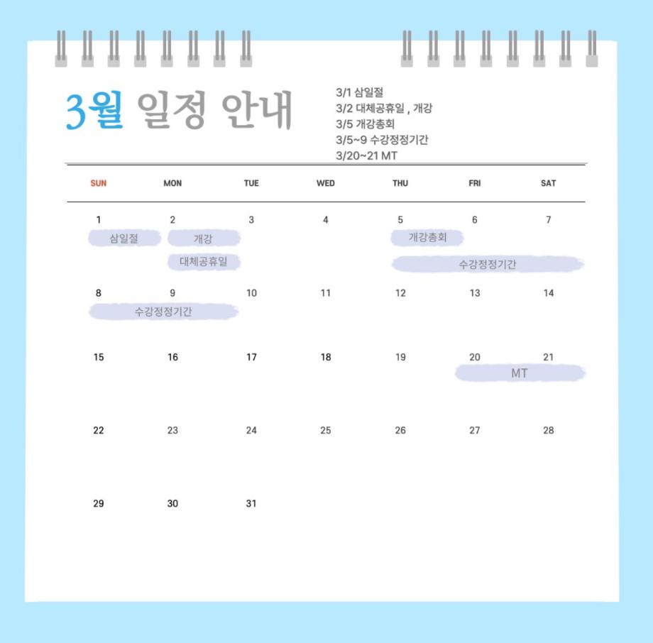 본문 시작 홈으로 커뮤니티 학과소개 입학정보 교과과정 커뮤니티 홈페이지가이드 포토갤러리 SNS 소통 공간 포토갤러리 공지사항 동아리 포토갤러리 페이스북 트위터 프린트 3월 다이어리 항공서비스학과 346 2026-03-25 안녕하십니까 세명대학교 항공서비스학과 온라인 홍보국 푸르미르 입니다 오늘은 3월 다이어리를 가져왔습니다! 3월에는 삼일절과 개강, 개강총회 그리고 수강정정기간 및 MT가 예정되어 있습니다 확인하시고 일정에 착오 없으시길 바라겠습니다! 소중한 꿈을 품고 그 누구보다 높이 오를 여러분들을 저희 "푸르미르"가 항상 응원하겠습니다 궁금한 사항이 있으시다면 언제든지 SNS로 연락 주십시오 목록 이전말레이시아 추천 맛집 다음 세명대학교 장학금제도