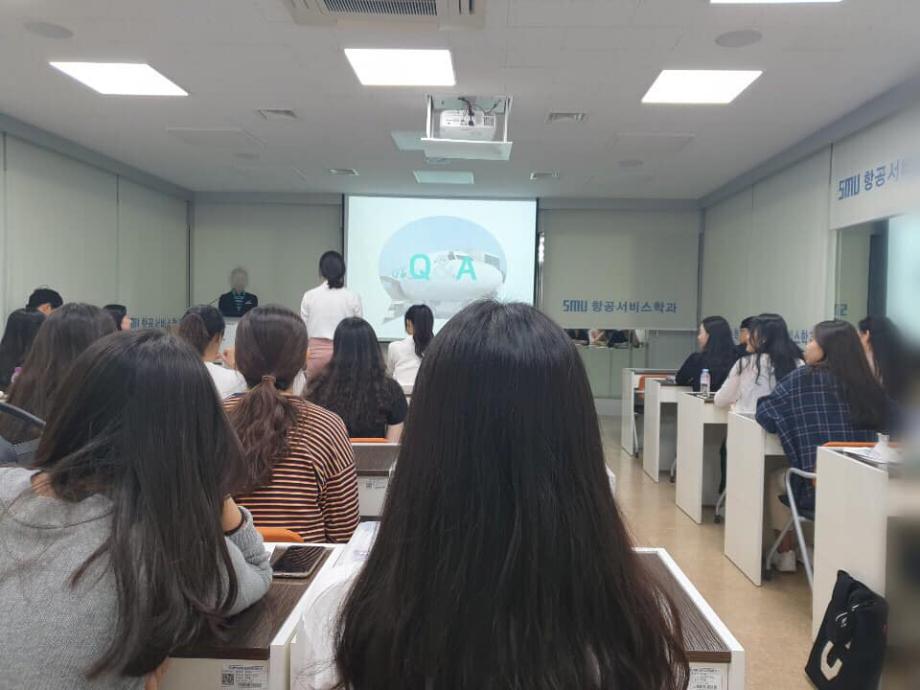 승무원님께서는 에어서울 항공사 소개, 4년간의 대학생활, 면접전형, 교육훈련, 승무원이 되기까지의 직접 경험하신 것들을 중점으로 특강을 진행해 주셨습니다 !