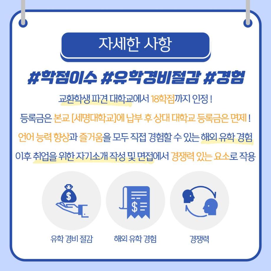 저희 세명대학교는 일본,중국,말레이시아,체코 등 다양한 학교로 교환학생을 신청할 수 있으면 합격률 1️⃣0️⃣0️⃣퍼센트를 보장하고 있습니다 !