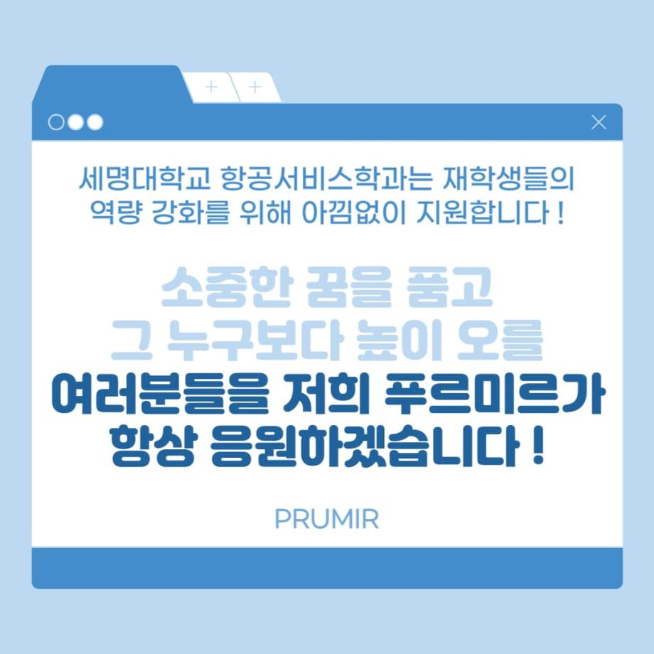 소중한 꿈을 품고 그 누구보다 높이 오를 여러분을 저희 “푸르미르”가 항상 응원하겠습니다 ✈️💙