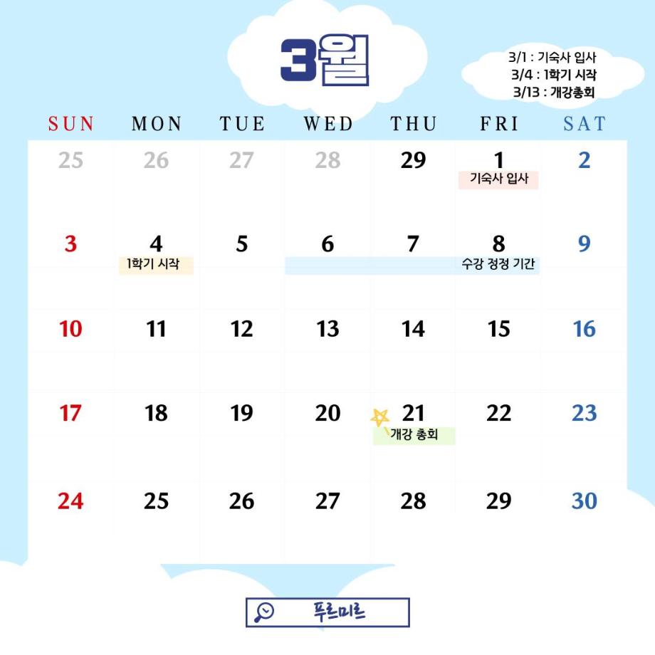 신학기로 들떠 있을 신입생 및 재학생 여러분들을 위한 3월 다이어리를 준비해보았으니 꼭 저장 하셔서 중요한 일정 체크하시면 좋겠습니다!!