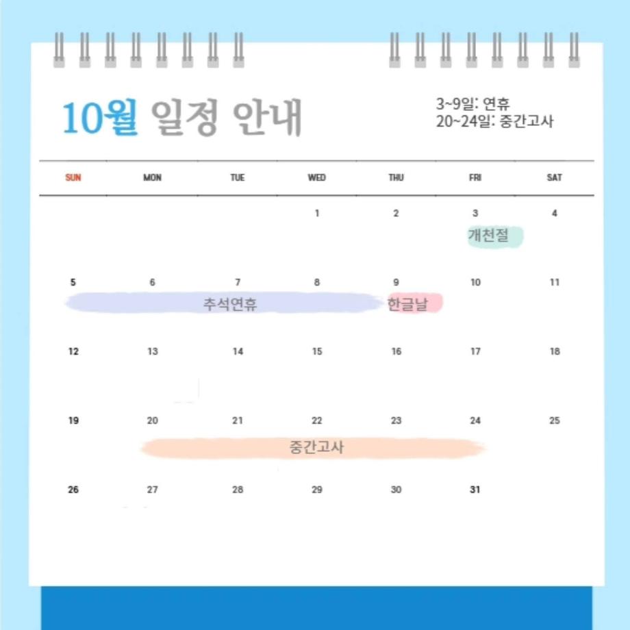본문 시작 홈으로 커뮤니티 학과소개 입학정보 교과과정 커뮤니티 홈페이지가이드 포토갤러리 SNS 소통 공간 포토갤러리 공지사항 동아리 포토갤러리 페이스북 트위터 프린트 10월 다이어리 항공서비스학과 3747 2025-10-06 안녕하십니까 세명대학교 항공서비스학과 온라인 홍보국 💙푸르미르💙입니다. 10월에는 추석연휴와 중간고사가 있습니다! 확인하시고 일정에 착오 없으시길 바라겠습니다 😊 즐거운 연휴 보내세요🙇♂️ 소중한 꿈을 품고 그 누구보다 높이 오를 여러분을 저희 "푸르미르" 가 항상 응원하겠습니다 ✈💙 궁금한 사항이 있으시다면 언제든지 SNS로 연락 주십시오 💬 #세명대학교 #항공서비스학과 #세명대 #항공과 #푸르미르 #다이어리 목록 다음 제주항공 에듀윙 Advanced class 다음 가을 맞이 일상 사진