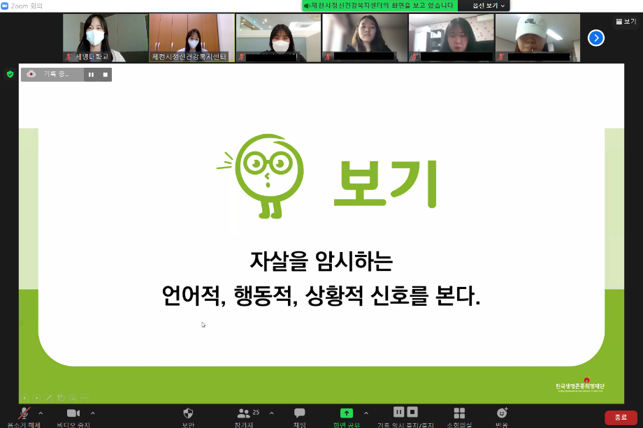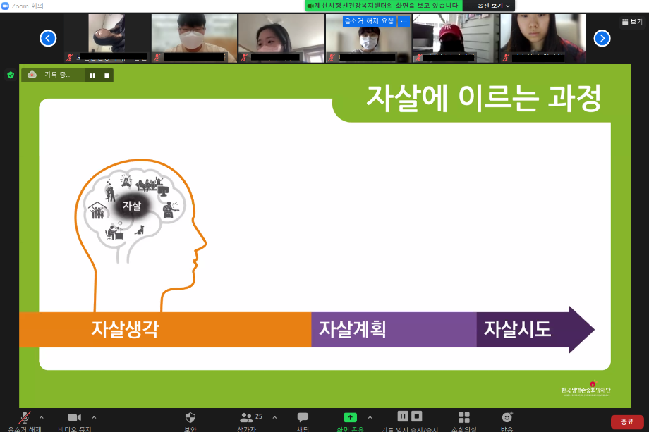 본문 시작 2022학년도 건강상담의 날 "자살예방교육"(05.11) CHARM케어상담센터 3704 2022-05-11 2022학년도 1학기 두번째 건강상담의 날 "자살예방교육"(2022.05.11) 목록 이전2022학년도 1학기 청년 대상 "방방곡곡" 마음안심버스 운영 이전2022학년도 CHARM케어상담센터 교내 캠페인 담당부서 : CHARM케어상담센터 담당자 : - 연락처 : 043-649-1789 최종수정일 : 2024-10-26 만족도조사 만족도 조사 이 페이지에서 제공하는 정보에 대하여 만족하시나요? 매우만족 만족 보통 불만족 매우불만족