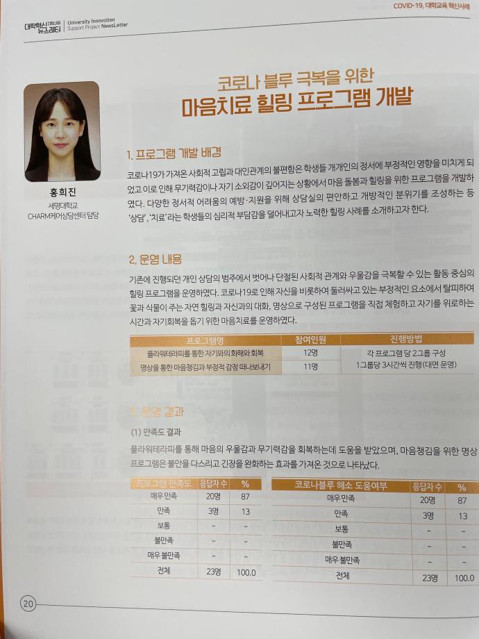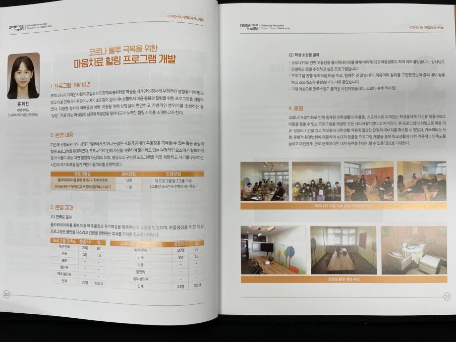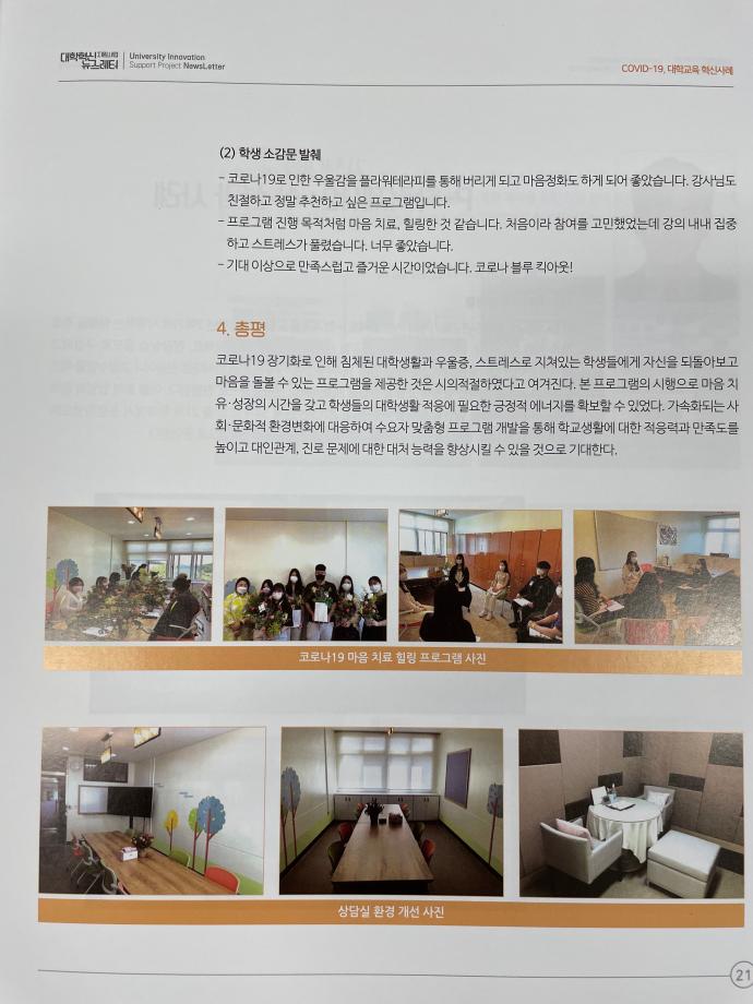본문 시작 2021학년도 대학혁신지원사업 뉴스레터 6호 소식지 <코로나-19 마음치료 힐링 프로그램> 기재 CHARM케어상담센터 3456 2021-08-24 2021학년도 대학혁신지원사업 뉴스레터 6호 소식지에 <코로나-19 마음치료 힐링 프로그램>이 우수 프로그램으로 기재되었습니다. 목록 이전인권서포터즈 노인학대예방의날 캠페인 다음 인권서포터즈 사회복지의날 캠페인 진행 담당부서 : CHARM케어상담센터 담당자 : - 연락처 : 043-649-1789 최종수정일 : 2024-10-26 만족도조사 만족도 조사 이 페이지에서 제공하는 정보에 대하여 만족하시나요? 매우만족 만족 보통 불만족 매우불만족