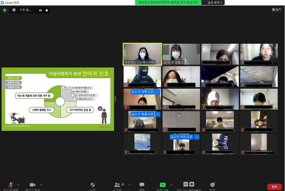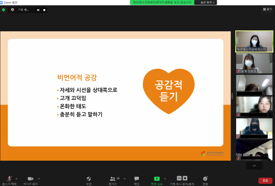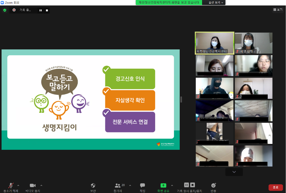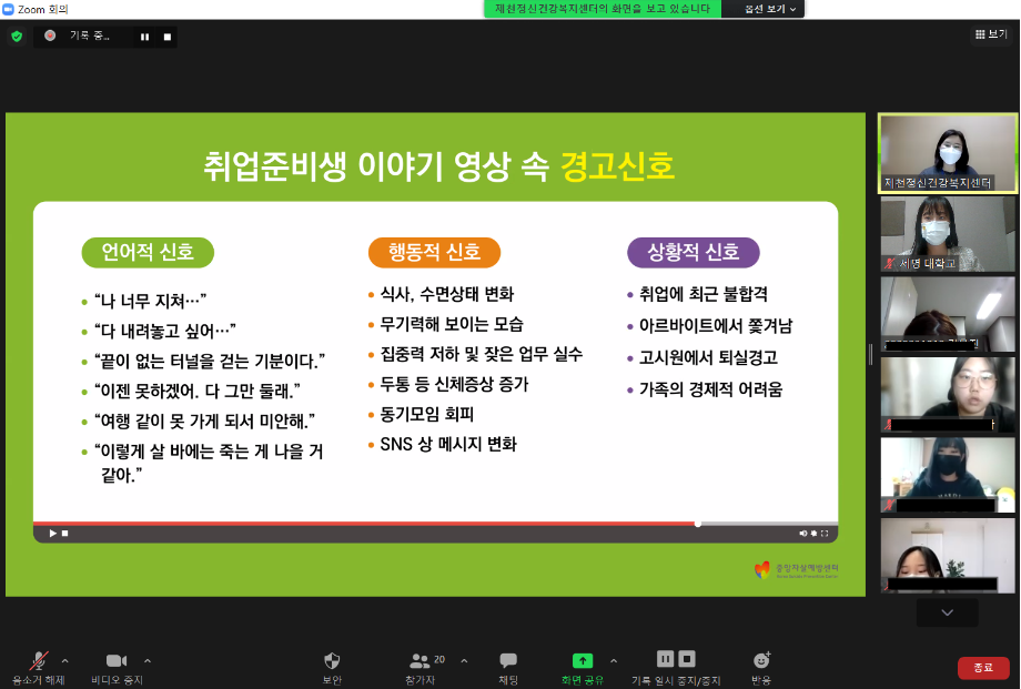 본문 시작 2021학년도 건강상담의 날 "자살예방교육"(10.26) 실시 CHARM케어상담센터 3606 2021-10-26 <건강상담의 날 "자살예방교육" 실시> 일시 : 10/26(화) 14:00~15:00 강사 : 제천시정신건강복지센터 팀장 신효진 목록 이전인권서포터즈 사회복지의날 캠페인 진행 다음 교내 폭력예방 캠페인 진행 담당부서 : CHARM케어상담센터 담당자 : - 연락처 : 043-649-1789 최종수정일 : 2024-10-26 만족도조사 만족도 조사 이 페이지에서 제공하는 정보에 대하여 만족하시나요? 매우만족 만족 보통 불만족 매우불만족