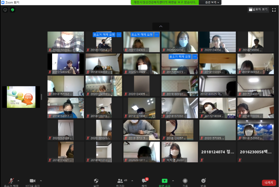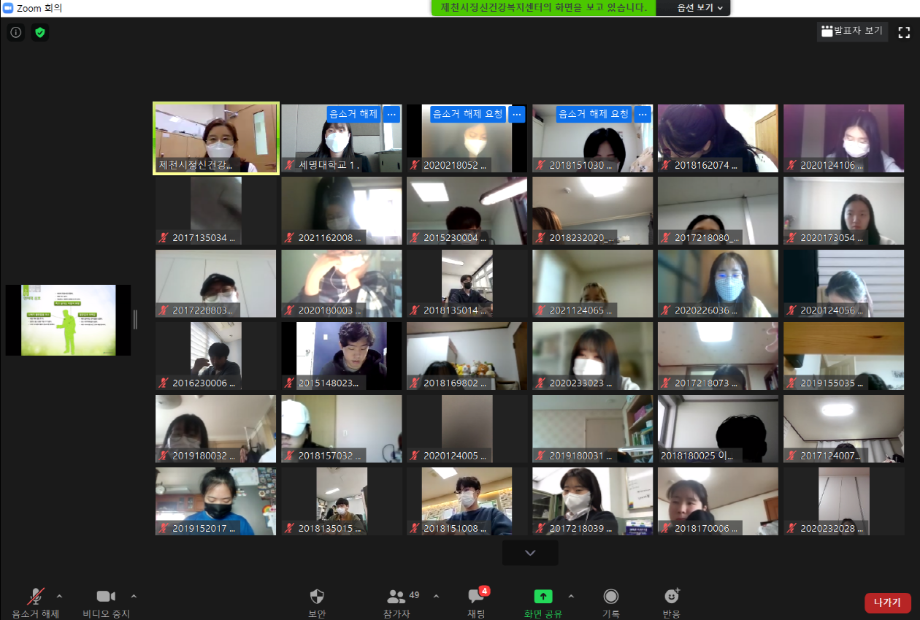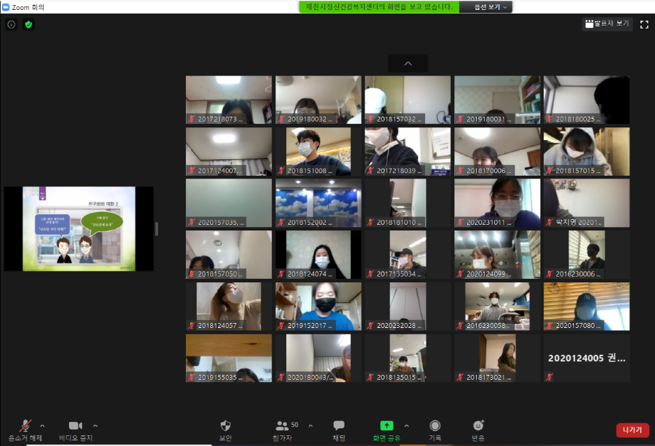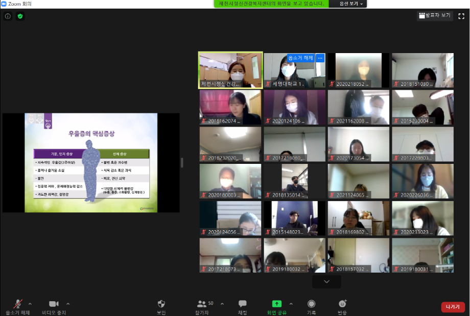 본문 시작 2021학년도 건강상담의 날 "자살예방교육" 실시 CHARM케어센터 3856 2021-04-23 <건강상담의 날 "자살예방교육" 실시> 일시 : 4/14(수) 14:00~15:30 강사 : 제천시정신건강복지센터 팀장 신효진 목록 이전2020학년도 CTI진로사고검사 재결정프로그램 "탄탄대로" (1차) 다음 2021학년도 인권서포터즈 'SMile' 발대식 담당부서 : CHARM케어상담센터 담당자 : - 연락처 : 043-649-1789 최종수정일 : 2024-10-26 만족도조사 만족도 조사 이 페이지에서 제공하는 정보에 대하여 만족하시나요? 매우만족 만족 보통 불만족 매우불만족