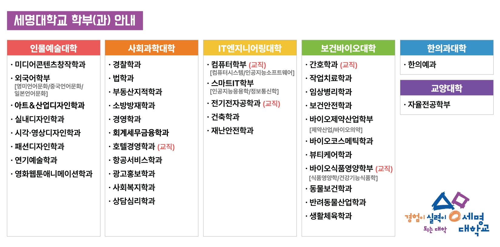 “재미있는 경험” 세명대학교의 학부(과) 안내 [학과별 주요 취업현황, 교육과정 체계도 등]입니다. 세명대학교 2026학년도 신입생모집 학부(과) 안내 다운로드