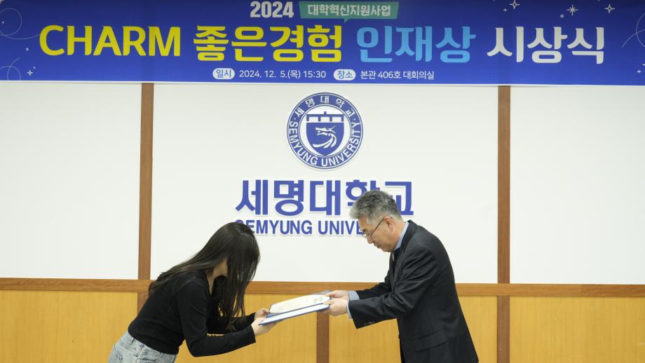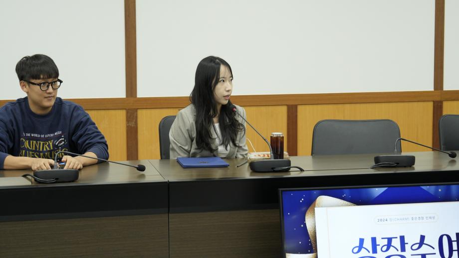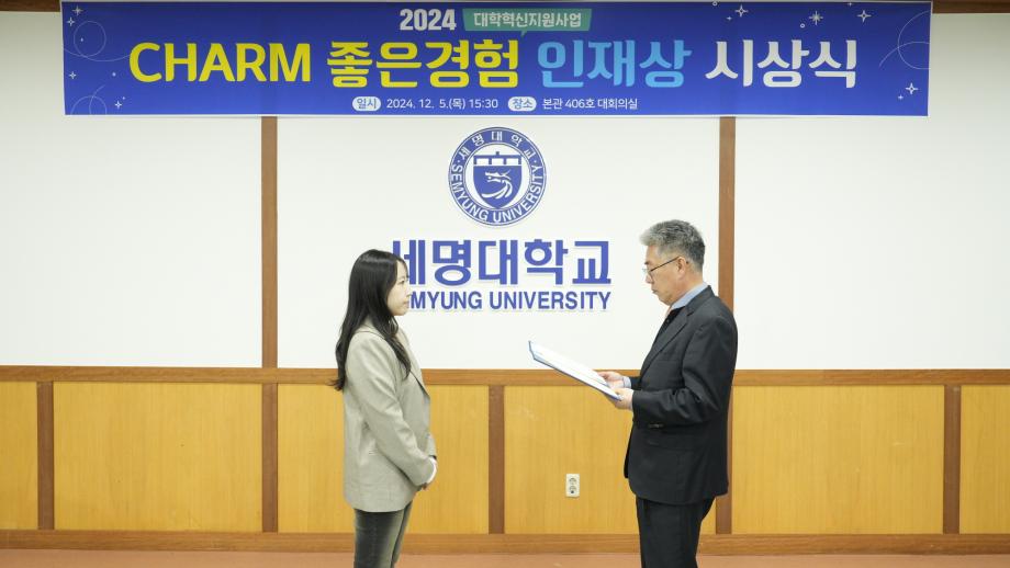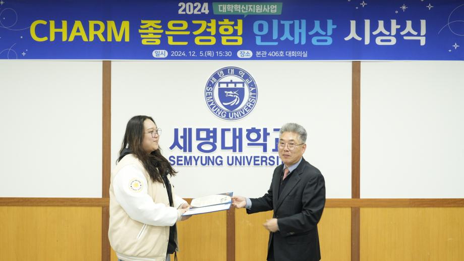 본문 시작 Photo SMU 세명소개 입학/취업 대학/대학원 학사지원 대학생활 연구/산학 기관/시설 SMU Story 소통·공감 학교기업 홈페이지가이드 학생활동 News@SMU 공지사항 보도자료 Photo SMU Media SMU 민송백일장 해카톤 경진대회 학생활동 페이스북 트위터 프린트 CHARM 좋은경험 인재상 시상식 홍보센터 4034 2024-12-05 CHARM 좋은경험 인재상 시상식 목록 이전제3회 학생위원회 최종보고회 다음 2025 신입생 오리엔테이션 '꿈설계학기' 담당부서 : 홍보센터 담당자 : 홍보센터 연락처 : 043-649-1175 최종수정일 : 2024-10-26 만족도조사 만족도 조사 이 페이지에서 제공하는 정보에 대하여 만족하시나요? 매우만족 만족 보통 불만족 매우불만족