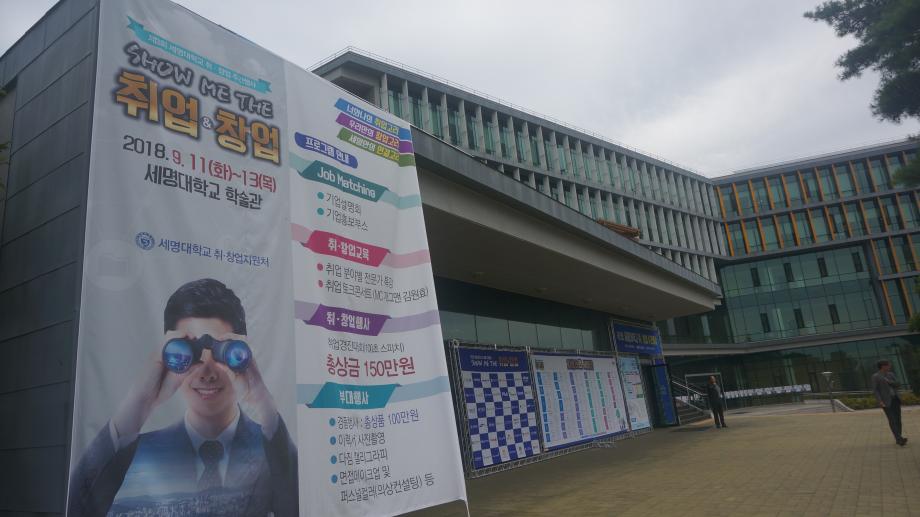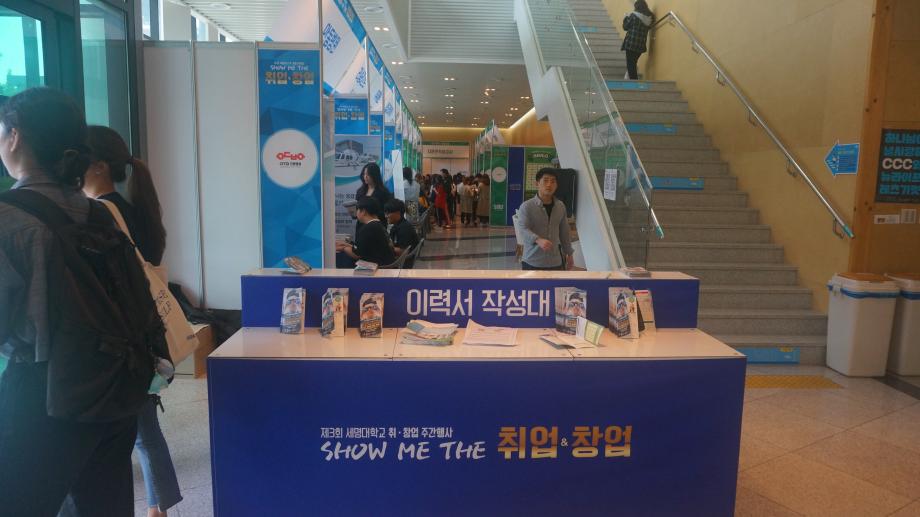 본문 시작 Photo SMU 세명소개 입학/취업 대학/대학원 학사지원 대학생활 연구/산학 기관/시설 SMU Story 소통·공감 학교기업 홈페이지가이드 학생활동 News@SMU 공지사항 보도자료 Photo SMU Media SMU 민송백일장 해카톤 경진대회 학생활동 페이스북 트위터 프린트 제3회 세명대학교 취창업주간행사 기획실 7046 2018-09-13 제3회 세명대학교 취창업주간행사 세명대학교 재학생의 취업과 창업 역량강화를 위한 행사이다. 취업과 창업을 위한 특강 및 설명회가 현장에서 진행되며 실제 기업 인사 담당자가 참가하는 채용부스도 운영한다. 그 외에도 면접 메이크업, 이력서 사진촬영, 인적성 검사 등 다채로운 부대행사도 지원한다. 목록 이전제28회 청룡축전 다음 중국어 시 낭송 대회 담당부서 : 홍보센터 담당자 : 홍보센터 연락처 : 043-649-1175 최종수정일 : 2024-10-26 만족도조사 만족도 조사 이 페이지에서 제공하는 정보에 대하여 만족하시나요? 매우만족 만족 보통 불만족 매우불만족