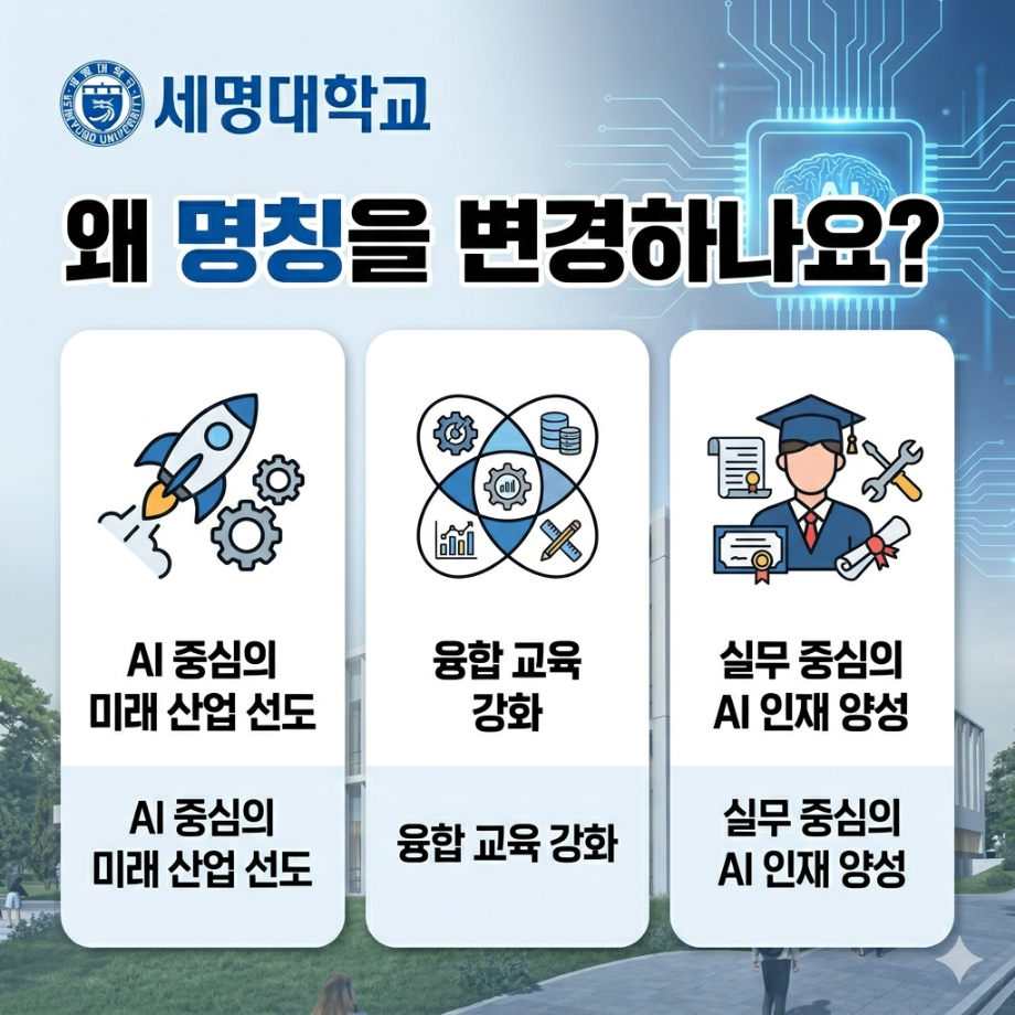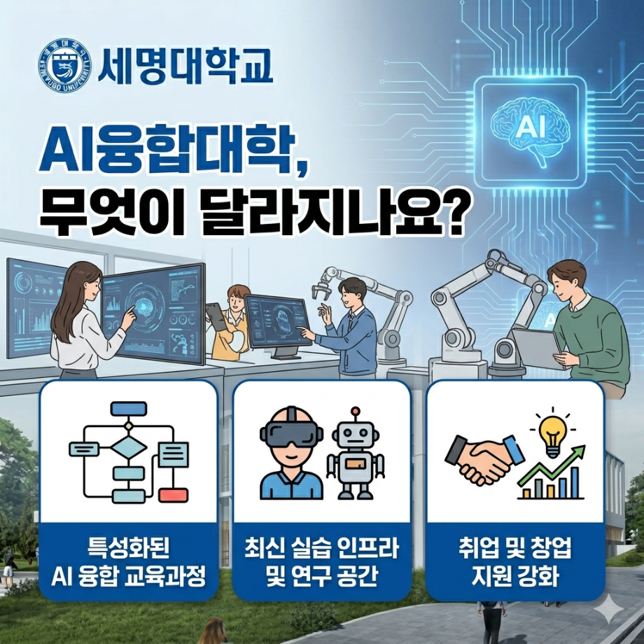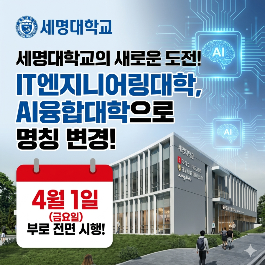 본문 시작 홈으로 커뮤니티 대학소개 학과소개 입학안내 커뮤니티 홈페이지가이드 포토갤러리 대학소식 학과소식 자료실 포토갤러리 포토갤러리 페이스북 트위터 프린트 IT엔지니어링대학이 'AI융합대학'으로 변경되었습니다. AI융합대학 19 2026-04-01 IT에서 AI로, 더 넓어진 미래 IT엔지니어링대학이 AI기반 융합 역량을 바탕으로 'AI융합대학'으로 도약하며 미래를 설계합니다. 새로운 시작ㅡ세명대학교와 함께 하세요. 목록 이전IT단과대를 알려드립니다 (3월) 다음 제5회 세명대학교 벚꽃축제 '벚꽃 세봄' 담당부서 : AI융합대학 담당자 : - 연락처 : 043-649-7422 최종수정일 : 2024-10-26 만족도조사 만족도 조사 이 페이지에서 제공하는 정보에 대하여 만족하시나요? 매우만족 만족 보통 불만족 매우불만족