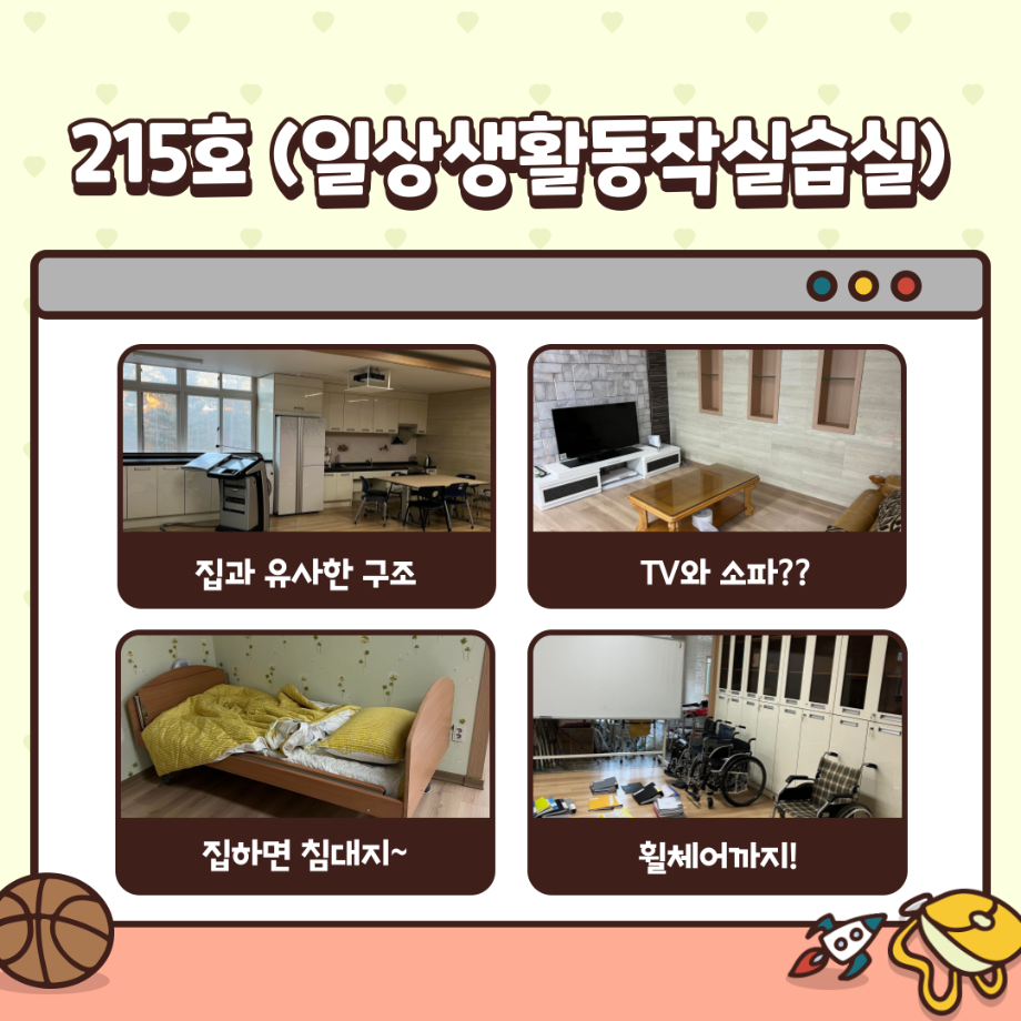 -> 집과 유사한 구조로 되있고 일상생활에서 자주 보이는 TV, 쇼파, 침대와 더불어 몸이 불편하신 분들이 사용하시는 휠체어 까지 마련되어있어 여태껏 보지 못했던 실습환경을 구경하실 수 있습니다.