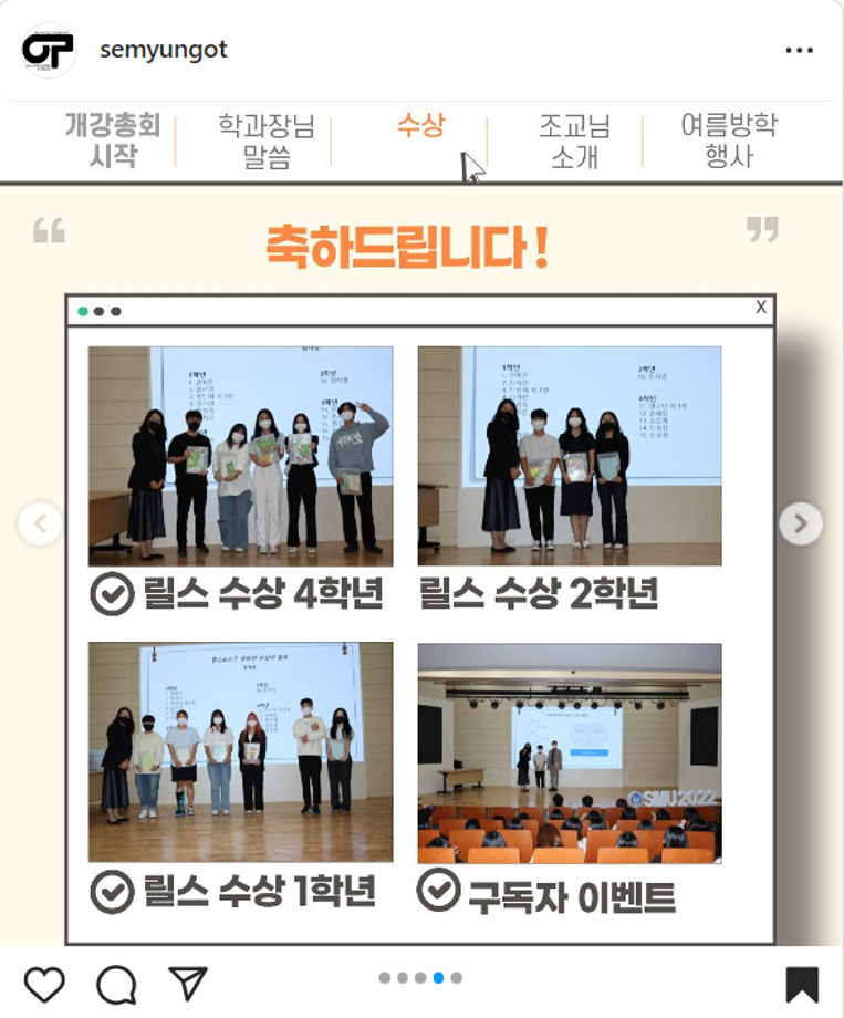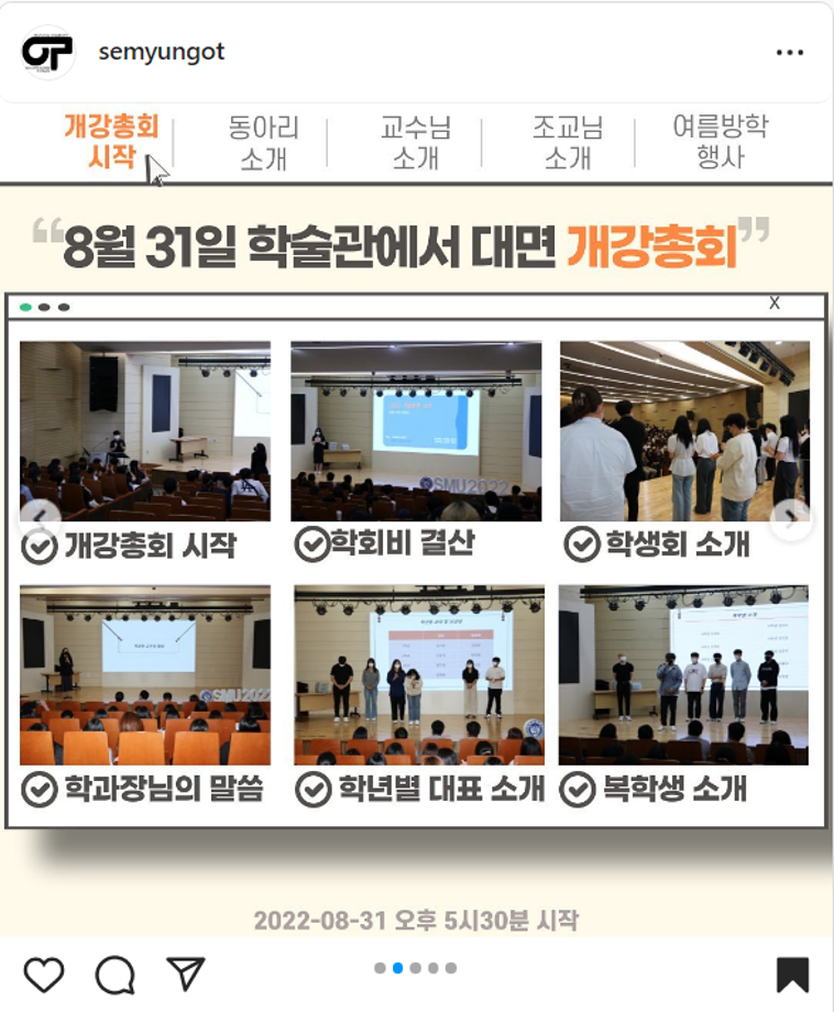 본문 시작 홈으로 커뮤니티 학과소개 진로 및 취업 학과과정 커뮤니티 SNS 홈페이지가이드 학과 소식 및 행사 학과공지 학과 소식 및 행사 대학생활 엿보기 어쩌다 출근 챌린지 학생회 동아리 통학버스 시간표 학과 소식 및 행사 페이스북 트위터 프린트 2022-2학기 개강총회 작업치료학과 4334 2022-09-05 목록 이전실습모듬후기 1편 다음 2022-2학기 개강총회 사진 담당부서 : 작업치료학과 담당자 : - 연락처 : 043-649-1632 최종수정일 : 2024-10-26 만족도조사 만족도 조사 이 페이지에서 제공하는 정보에 대하여 만족하시나요? 매우만족 만족 보통 불만족 매우불만족