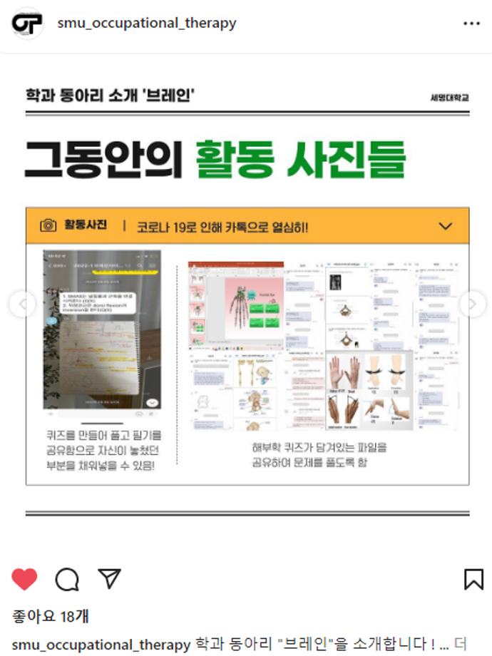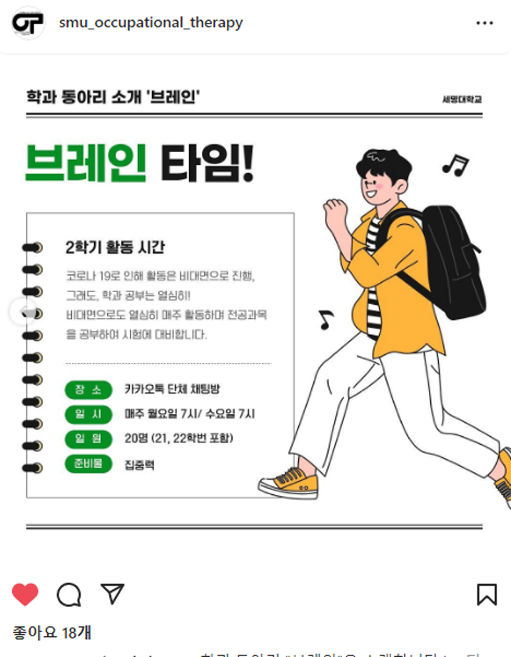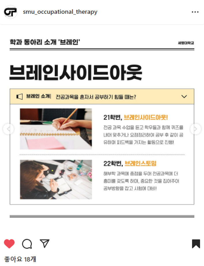 본문 시작 홈으로 커뮤니티 학과소개 진로 및 취업 학과과정 커뮤니티 SNS 홈페이지가이드 학과 소식 및 행사 학과공지 학과 소식 및 행사 대학생활 엿보기 어쩌다 출근 챌린지 학생회 동아리 통학버스 시간표 학과 소식 및 행사 페이스북 트위터 프린트 동아리 소개[브레인] 작업치료학과 4521 2022-10-13 목록 이전semyung birthday cake challenge 다음 동아리 소개[세슐랭] 담당부서 : 작업치료학과 담당자 : - 연락처 : 043-649-1632 최종수정일 : 2024-10-26 만족도조사 만족도 조사 이 페이지에서 제공하는 정보에 대하여 만족하시나요? 매우만족 만족 보통 불만족 매우불만족
