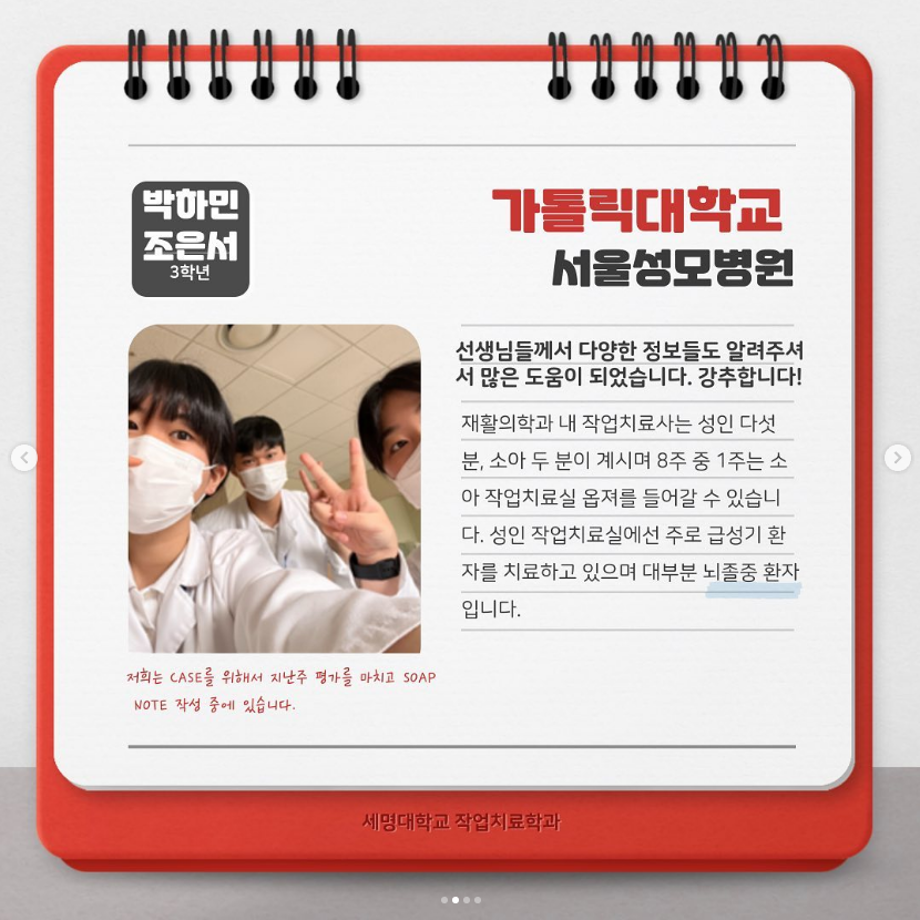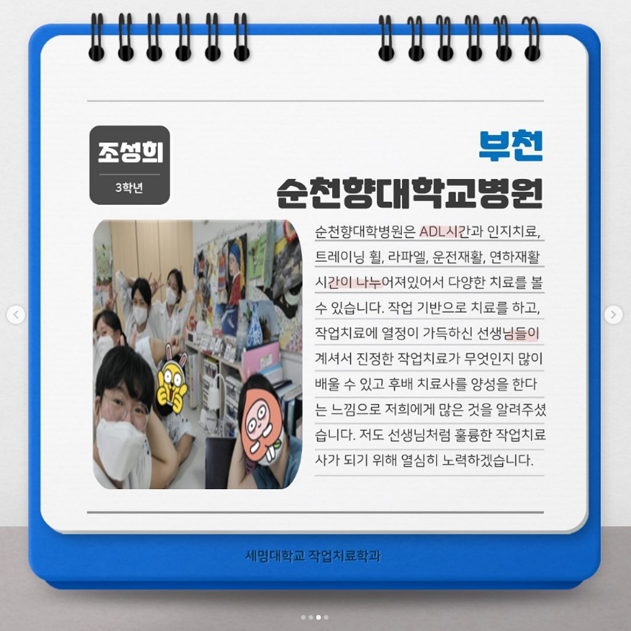 본문 시작 홈으로 커뮤니티 학과소개 진로 및 취업 학과과정 커뮤니티 SNS 홈페이지가이드 학과 소식 및 행사 학과공지 학과 소식 및 행사 대학생활 엿보기 어쩌다 출근 챌린지 학생회 동아리 통학버스 시간표 학과 소식 및 행사 페이스북 트위터 프린트 2022 실습후기모음 (아동파트 대학병원, 종합병원) 작업치료학과 4762 2022-11-01 목록 이전동아리 소개 [초코파이] 다음 동아리 소개 [지태사] 담당부서 : 작업치료학과 담당자 : - 연락처 : 043-649-1632 최종수정일 : 2024-10-26 만족도조사 만족도 조사 이 페이지에서 제공하는 정보에 대하여 만족하시나요? 매우만족 만족 보통 불만족 매우불만족