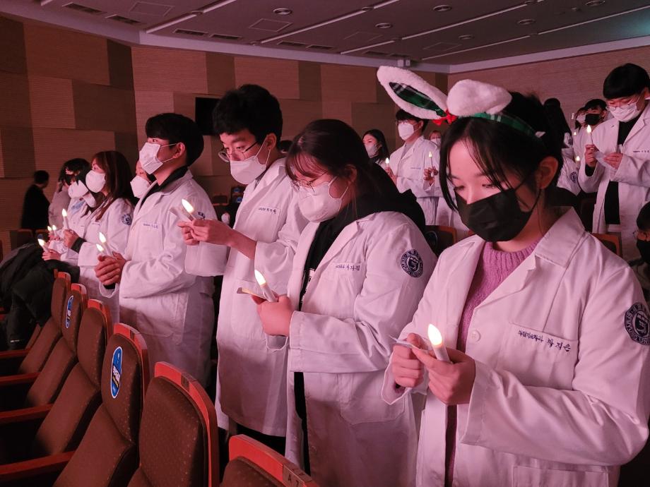 가운식 진행은 2학년 선배들이 1학년 후배에게 가운을 입혀주고 촛불에 불을 붙여주면 1학년 학생들은 촛불을 들고 윤리강령을 낭독하며 작업치료사가 되기 위한 마음을 다잡고 윤리강령을 통해 앞으로 작업치료사가 되기 위해 나아가는 자신들을 약속한다.