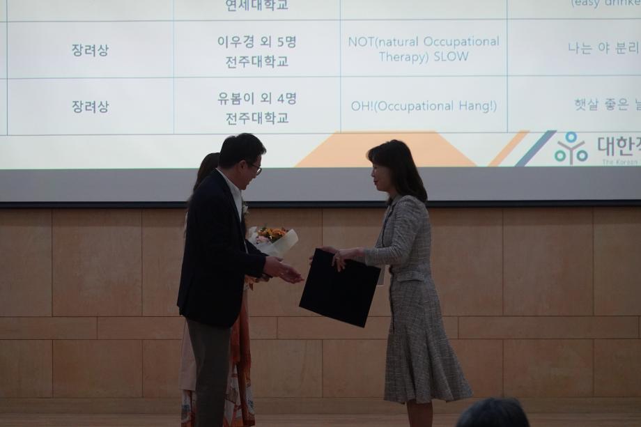 지난 10월 26일 건양대학교 메디컬캠퍼스 죽헌정보관 리버럴아츠홀에서 진행된 “2024년 대한작업치료학회 ‘The Next Wave: 작업치료의 통합적 접근’이라는 주제로 학술대회를 개최”하였다. 오전 Opening Ceremony에는 대한작업치료학회장을 비롯하여 대한작업치료사협회 협회장, 전국대학작업치료교수협의회장, 건양대학교 총장, 전국작업치료지회장, 한국작업치료교육평가원 WFOT 위원장, 한국작업치료교육평가원 사무국장 등의 귀빈이 초대되어 참석하여 자리를 빛내주었다. 행사 사회자는 대한연하학회 학회장 세명대학교 작업치료학과 서상민교수로 각종 협회 시상과 교수협의회 시상이 진행하였으며, 마지막으로 세계작업치료사연맹(WFOT) 교육인증 및 작업치료교육 인증을 획득한 대학에 대해 인증서를 전달하는 자리가 마련되었다.