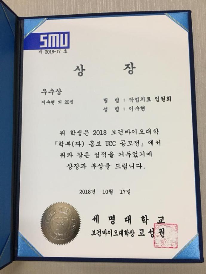 본문 시작 홈으로 커뮤니티 학과소개 진로 및 취업 학과과정 커뮤니티 SNS 홈페이지가이드 학과 소식 및 행사 학과공지 학과 소식 및 행사 대학생활 엿보기 어쩌다 출근 챌린지 학생회 동아리 통학버스 시간표 학과 소식 및 행사 페이스북 트위터 프린트 작업치료학과 홍보 UCC 공모전 우수상 수상 작업치료학과 7173 2018-10-19 10월 17일, 보건바이오대학이 주최하는 학부(과) 홍보 UCC 공모전에서 저희 작업치료학과가 우수상을 받게 되었습니다.👍 홍보부장 이수현 학생이 대표로 상을 받았습니다.😊 임원진들이 함께 개사를 하여 녹음을 하였고, 서상민 교수님께서 특별 출연을 해주셨습니다.❤️ 좋은 UCC 작품이 나올 수 있게 한 임원진 모두 수고 많으셨습니다.💓 목록 이전작업치료학과 과소풍 다음 2018 1차 학술특강 실시 담당부서 : 작업치료학과 담당자 : - 연락처 : 043-649-1632 최종수정일 : 2024-10-26 만족도조사 만족도 조사 이 페이지에서 제공하는 정보에 대하여 만족하시나요? 매우만족 만족 보통 불만족 매우불만족