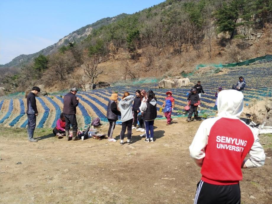 2019년 3월 23일 청풍면 학현리 아름마을 농촌에 다녀왔습니다☺️고추밭 비닐 포장🌱,땅파기,고구마밭 퇴비주기, 오이지주 운반등 여러명씩 조를 만들어 밭일을 하였습니다. 고된 농촌일로 학생들 모두 조금씩 지친 기색을 보였지만, 친할머니 친할아버지의 일손을 돕는다고 생각하고 모두들 성실히💪 봉사에 임한 결과 저희는 성공적으로 농촌봉사 활동을 마무리 할 수 있었습니다 저희는 이번 봉사 활동을 통해서 남을 돕는 기쁜 마음과 끈기를 배울 수 있었습니다.