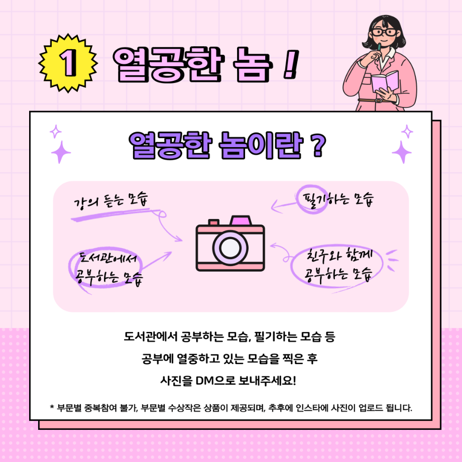 이번 사진공모전 주제는 <놈. 놈. 놈.> - 열공한 놈, 포기한 놈, 이상한 놈으로 3가지 부문에 맞는 사진을 경찰학과 인스타 DM으로 보내주세요!