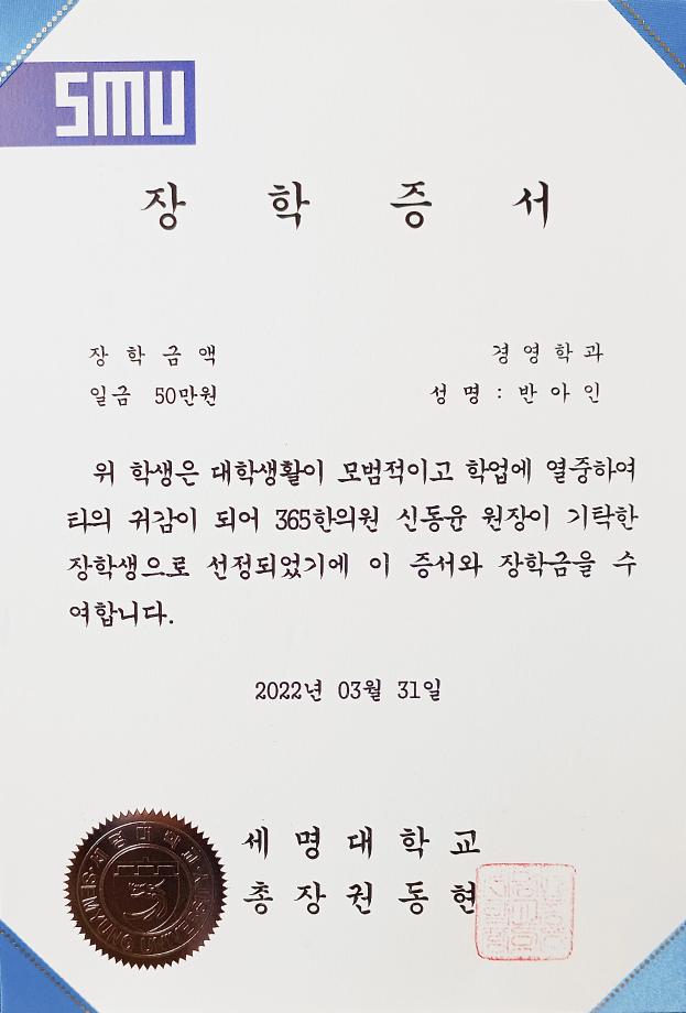 본문 시작 홈으로 커뮤니티 학과소개 학생진로 교과과정 커뮤니티 학과 SNS 홈페이지가이드 학과 갤러리 공지사항 대학원 학과 갤러리 학과 이야기 동아리 학생회 학과 갤러리 페이스북 트위터 프린트 경영학과 20학번 반아인 장학생 경영학과 2587 2022-04-06 03월 31일, 경영학과 20학번 반아인 학생은 학업성적이 우수하고 성실한 학과 생활로 타의 귀감이 되어 365한의원 신동윤 대표원장이 기탁한 장학생으로 선정되었으며 장학금 기탁 및 장학증서 수여식에 참석하였습니다. 목록 이전사회 새내기의 필수 역량 강화 다음 2022 경영학과 체육대회 담당부서 : 경영학과 담당자 : - 연락처 : 043-649-1766 최종수정일 : 2024-10-26 만족도조사 만족도 조사 이 페이지에서 제공하는 정보에 대하여 만족하시나요? 매우만족 만족 보통 불만족 매우불만족