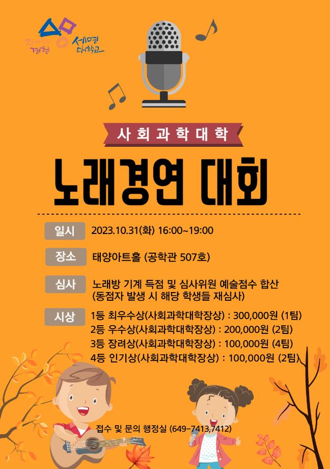 본문 시작 홈으로 커뮤니티 학과소개 학생진로 교과과정 커뮤니티 학과 SNS 홈페이지가이드 학과 갤러리 공지사항 대학원 학과 갤러리 학과 이야기 동아리 학생회 학과 갤러리 페이스북 트위터 프린트 [경영학과] 사회과학대학 노래경연대회 수상 경영학과 3302 2023-11-16 안녕하세요, 세명대학교 경영학과입니다! 10월 31일 화요일에 진행되었던 사회과학대학 노래경연대회에서 20학번 문정현 학생은 최우수상을, 21학번 신인애 학생은 장려상을 수상하였습니다! 멋진 무대와 감미로운 노래 실력 보여준 두 학생에게 큰 박수 부탁드립니다ㅎㅎ 목록 이전[경영학과] 대학원 논문 발표 다음 [경영학과] 한국생산관리학회 우수발표 논문상 수상 담당부서 : 경영학과 담당자 : - 연락처 : 043-649-1766 최종수정일 : 2024-10-26 만족도조사 만족도 조사 이 페이지에서 제공하는 정보에 대하여 만족하시나요? 매우만족 만족 보통 불만족 매우불만족
